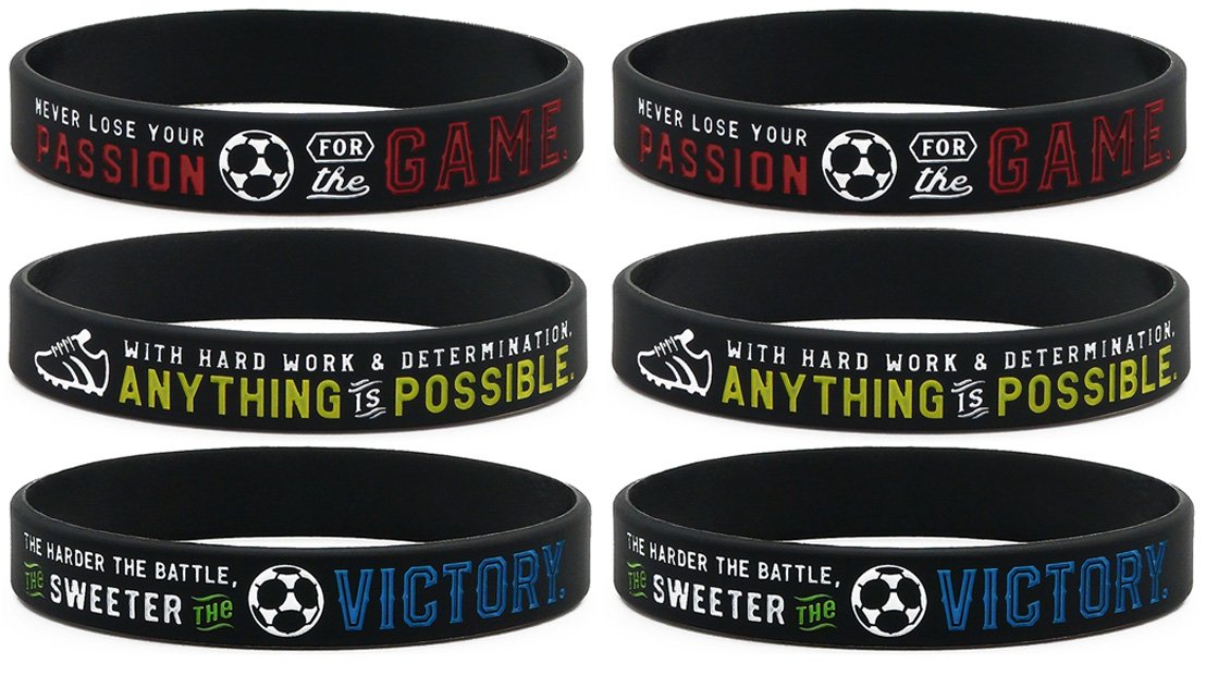 - Pack of 6 soccer silicone wristbands with motivational messages; Unisex adult size of 8 inches around fits most men, women, and teen wrist sizes