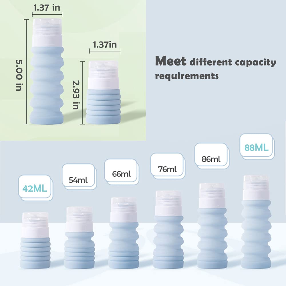 - COLLAPSIBLE DESIGN: Enjoy various capacities and sizes depending on your own needs with these leakproof travel bottles, which have an innovative collapsible design, being extended from 42ml to 88ml within seconds!