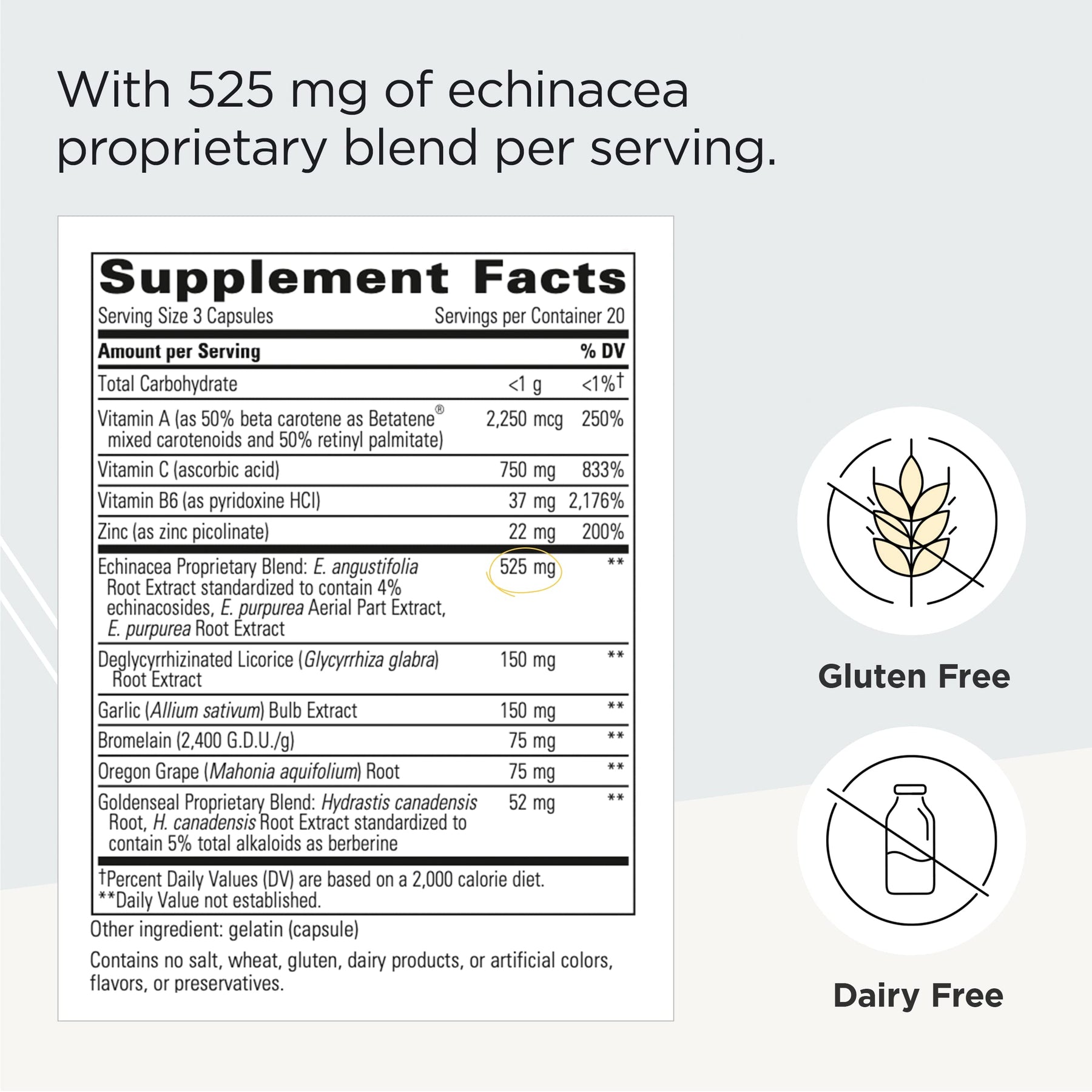 | ingredients | Vitamin A (50% beta-carotene as Betatene mixed carotenoids and retinyl palmitate) 7,500 IU, Vitamin C (ascorbic acid) 750 mg, Vitamin B6 (as pyridoxine HCl) 37 mg, Zinc (as zinc picolinate) 22 mg, Echinacea Proprietary Blend: E. angustifolia whole plant extract; E. pallida whole plant extract, E. purpurea whole plant extract, E. purpurea aerial part extract, E. angustifolia root extract standardized to contain 4% echinacosides 525 mg, Garlic (Allium sativum) Bulb Extract 150 mg, Licorice… |