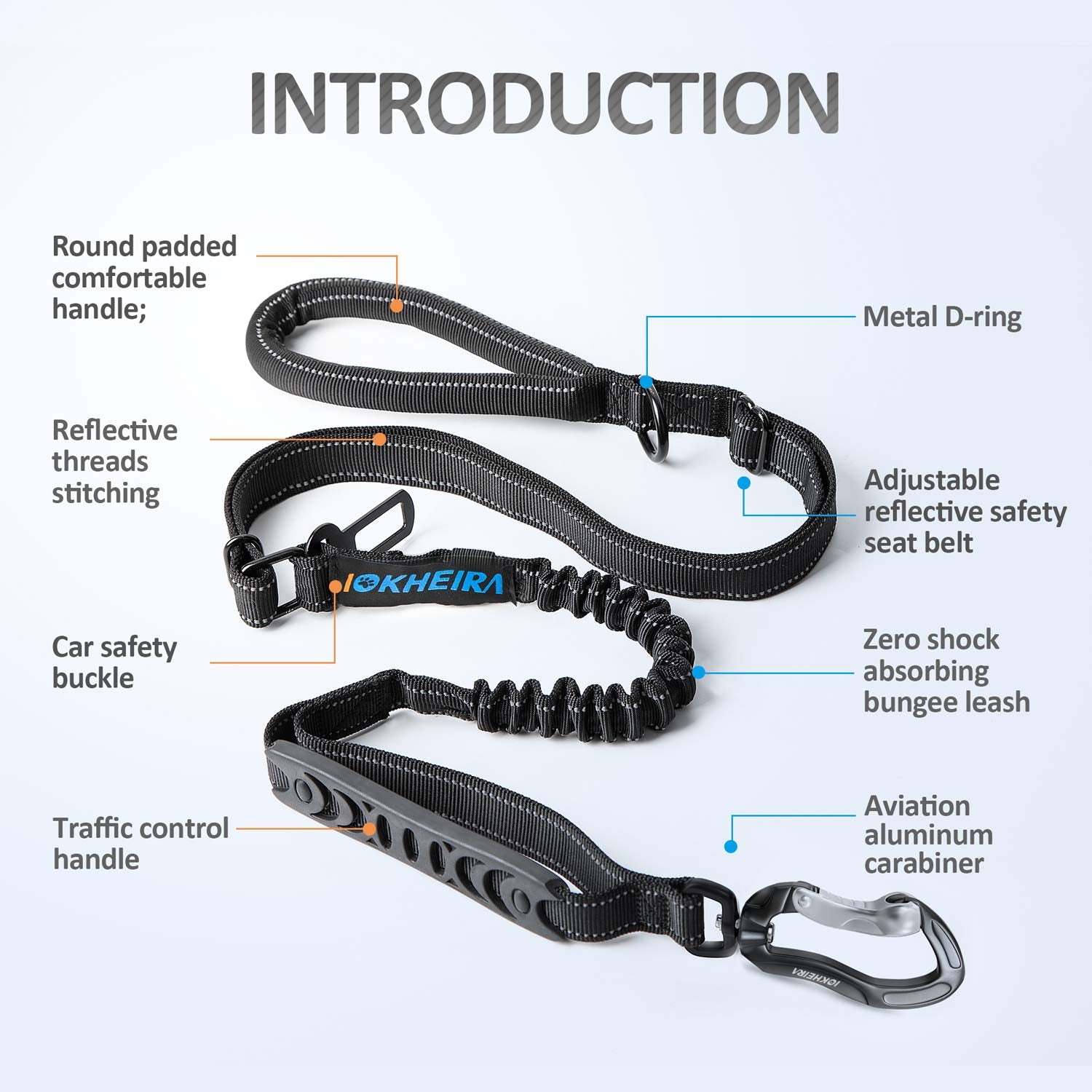 - Elastic Bungee Dog Leash: IOKHEIRA dog leash uses innovative Zero Shock Technology to absorb shock coming from dog pull. That will help you to control your dog and make the walk with your dog more enjoyable.