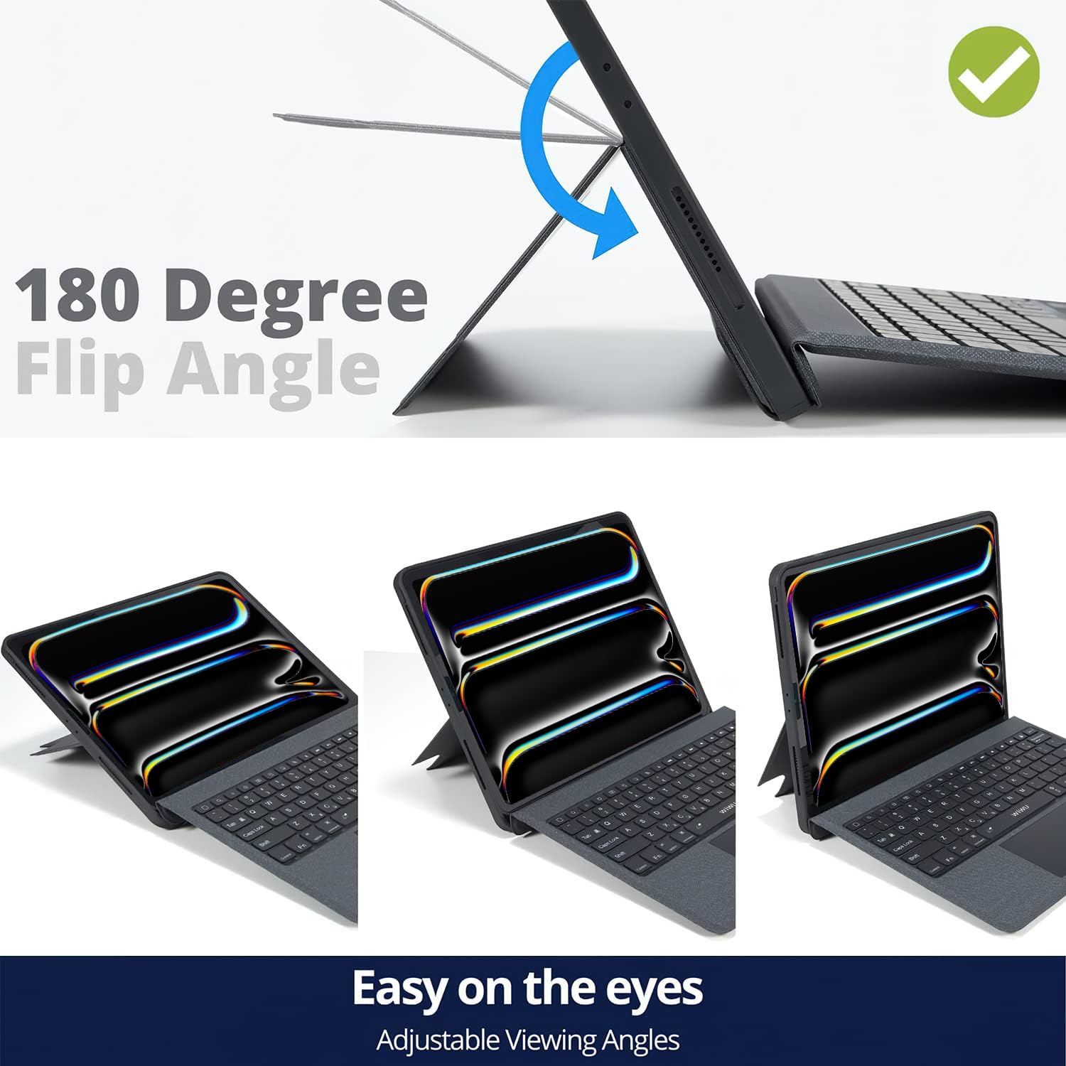 - Magnetic Detachable Keyboard & Multiple Viewing Angles for iPadThe keyboard for iPad Pro 12.9 firmly attaches to the protective case via a long magnetic strip, allowing it to be detached and stored separately, leaving only the protective case and the back stand. The stable and flexible stand offers multiple angles from 0 to 180 degrees, enabling you to adjust the screen to any desired angle or position, including standing vertically