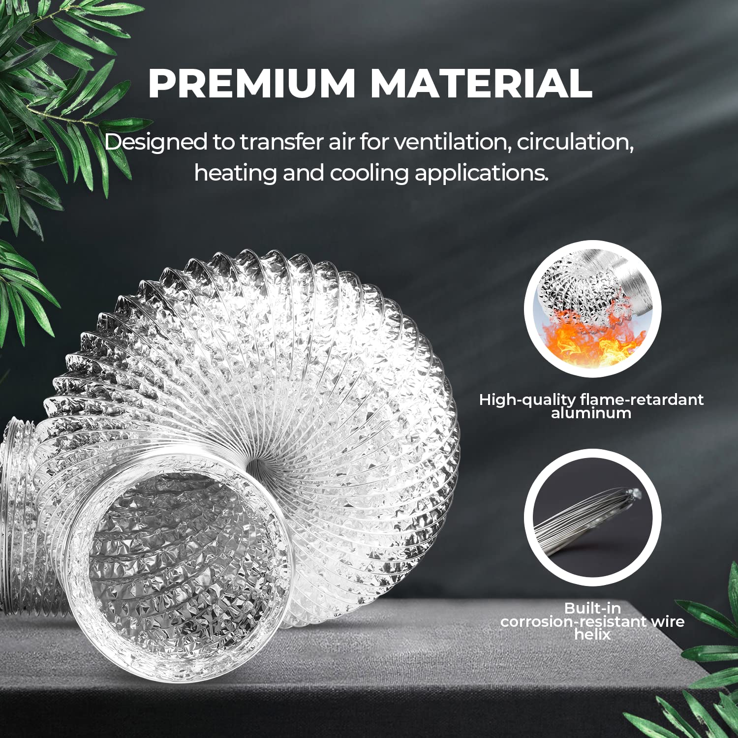 - Fireproof coating: flexible ventilation ducting made from high-quality flame-retardant aluminum and built-in corrosion-resistant wire helix for reinforcement and lasting performance.