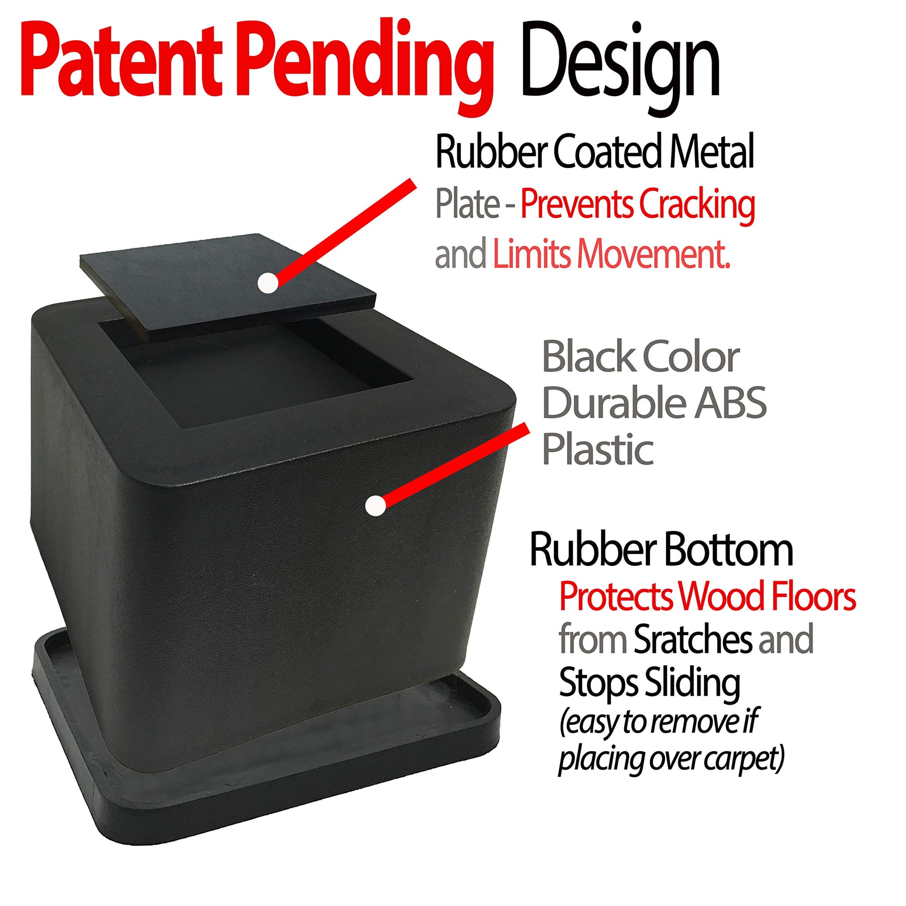 - ELEVATION UP TO 3 INCHES PER RISER & LIFTS OVER 6,800 LBs PER LEG - Our patent pending new version of this heavy duty bed lift risers has an anti-skid foam grip pad that helps to prevent bed wheels rolling on the tip of the riser and gives firm grip due to non-slip foam protector.