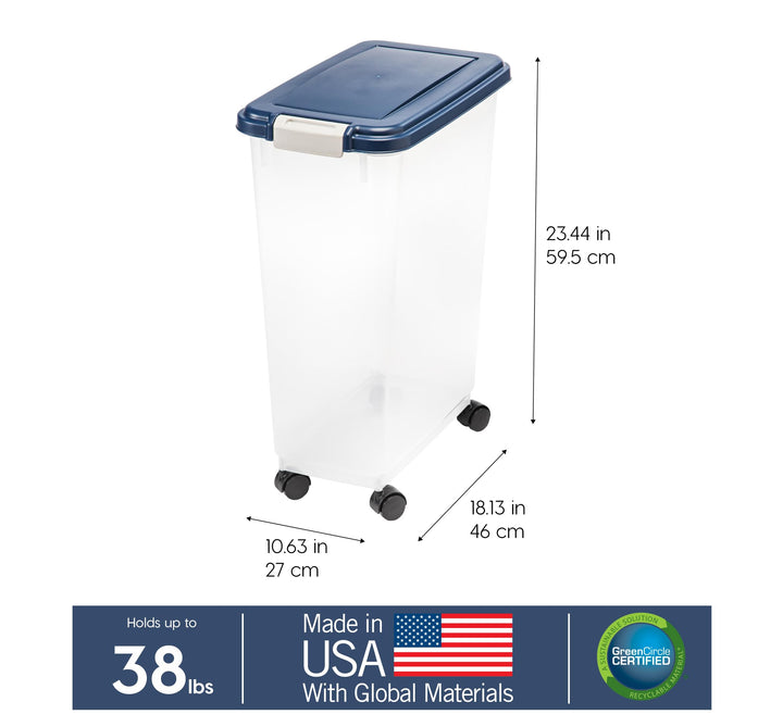 - Original Food Storage – IRIS USA Airtight Dog Food Storage Container, Up to 38 lbs, Attachable Wheels, For Dog Cat Bird and Other Pet Food Storage Bin, Keep Fresh, Translucent Body, Easy Mobility, Navy by Iris