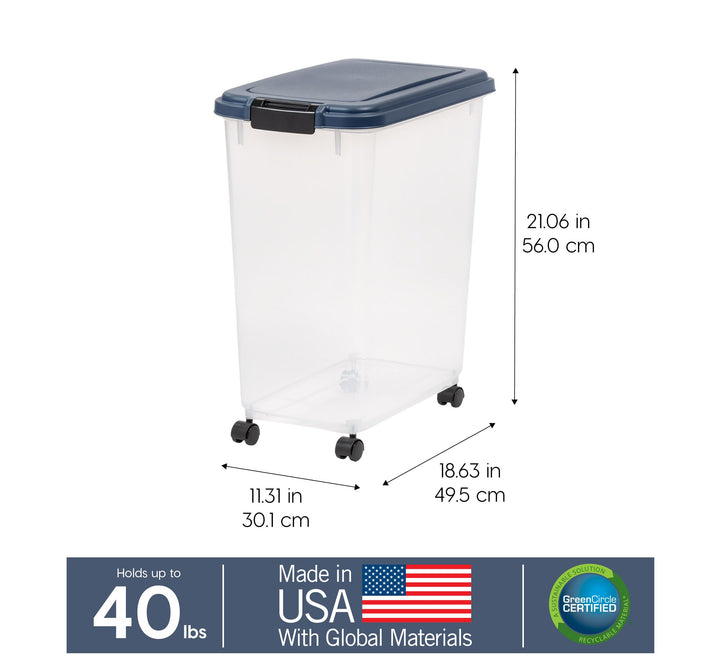 - Original Food Storage – USA Airtight Dog Food Storage Container, Up to 40 lbs, Attachable Wheels, For Dog Cat Bird and Other Pet Food Storage Bin, Keep Fresh, Translucent Body, Easy Mobility, Navy by IRIS