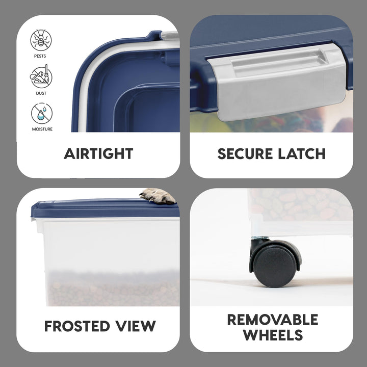 - Original Food Storage – USA Airtight Pet Food Storage Container, Up to 54 lbs, Attachable Wheels, For Dog Cat Bird and Other Pet Food Storage Bin, Keep Fresh, Easy Mobility, BPA Free, Navy/Pearl by IRIS