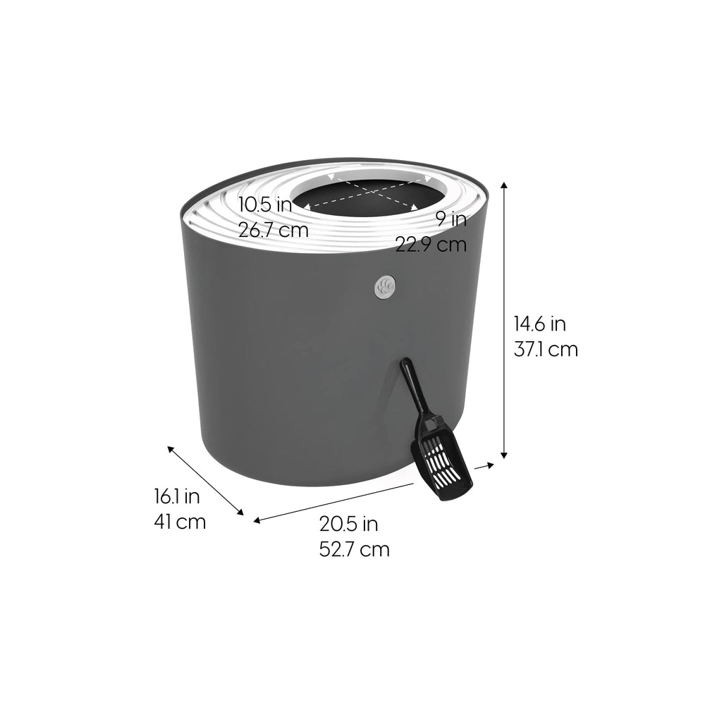- Original Standard Litter Boxes – USA Cat Litter Box, Top Entry Litter Box with Scoop, Stylish Round Cat Litter Box Enclosure, Kitty Litter Box, Dark Gray/White by IRIS