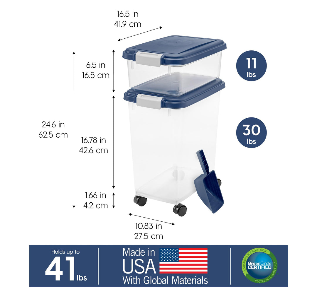 - Original Food Storage – USA Dog Food Storage Container, 30 lbs & 11 lbs Combo, Cat Food Storage Container, Dog Treat Container, Airtight, Stackable, 2-Cup Scoop, Wheels, Easy Mobility, Navy by IRIS