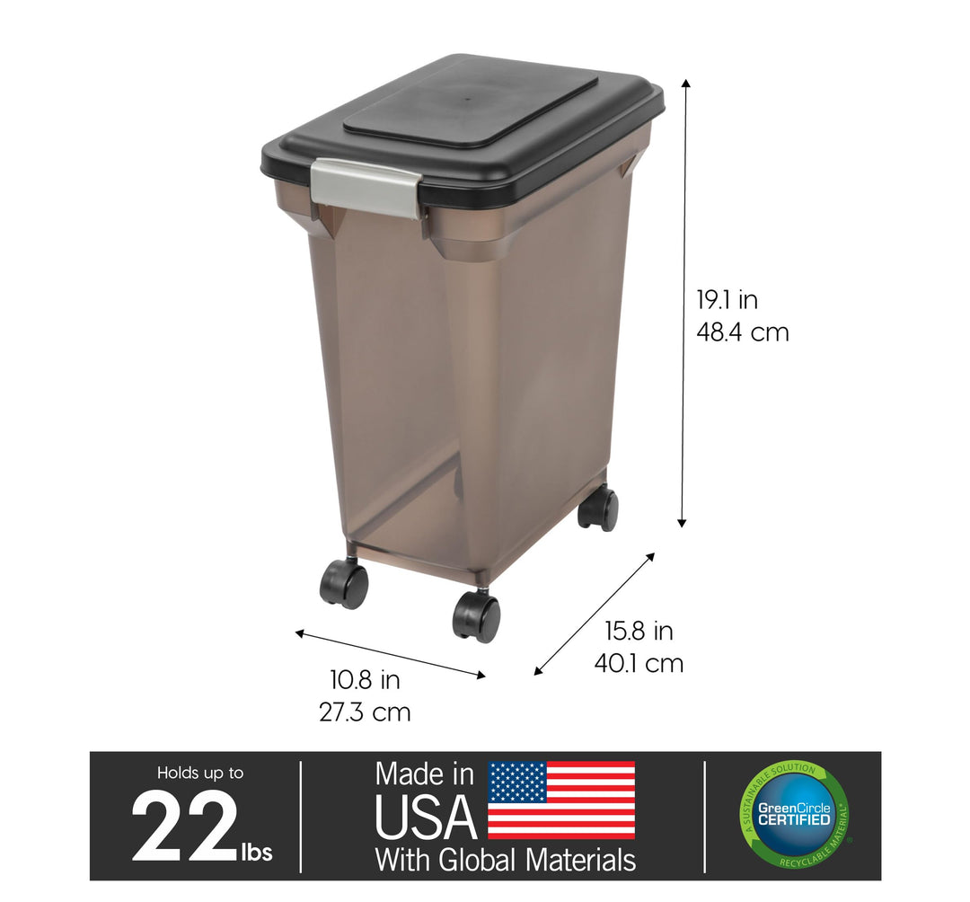 - Original Food Storage – USA WeatherPro Airtight Dog Food Storage Container, Up to 22 lbs, Attachable Wheels, For Dog Cat Bird and Other Pet Food Storage Bin, Keep Fresh, Easy Mobility, BPA Free, Smoke by IRIS