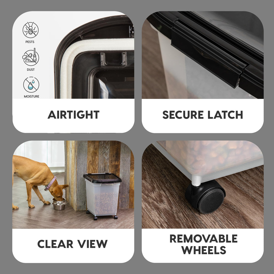 - Original Food Storage – USA WeatherPro Airtight Dog Food Storage Container, Up to 25 lbs, Removable Wheels, for Dog Cat Bird and Other Pet Food Storage Bin, Keep Fresh, Translucent Body, Clear/Black by IRIS