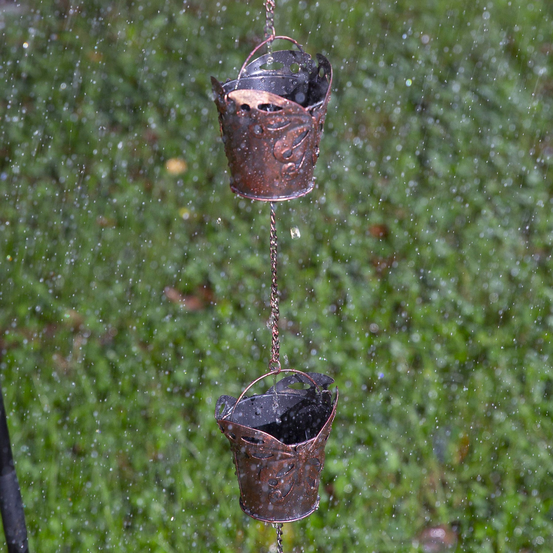 • EASILY ADJUST THE LENGTH BY ADDING ON MORE – Each order includes one chain that measures 35 inches long and comes with five Butterfly buckets attached. If you need a longer downspout diverter, you can purchase multiple rain chains and quickly connect them.
