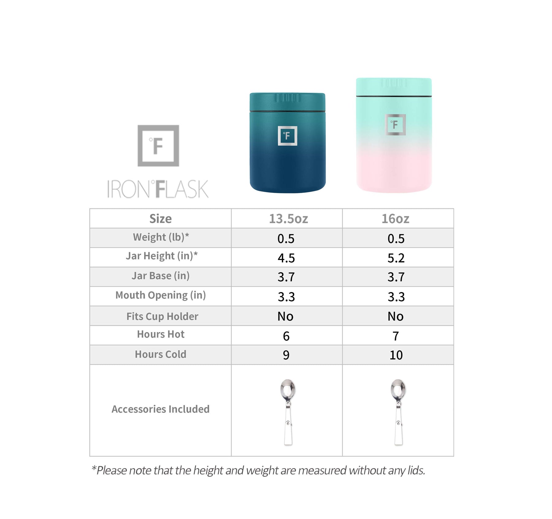 - INSULATED FOOD JAR: Goodbye sweat! The double wall insulation makes the Iron Flask sweat-free! It keeps your food COLD for up to 10 hours, and HOT for up to 7 hours, depending on size.