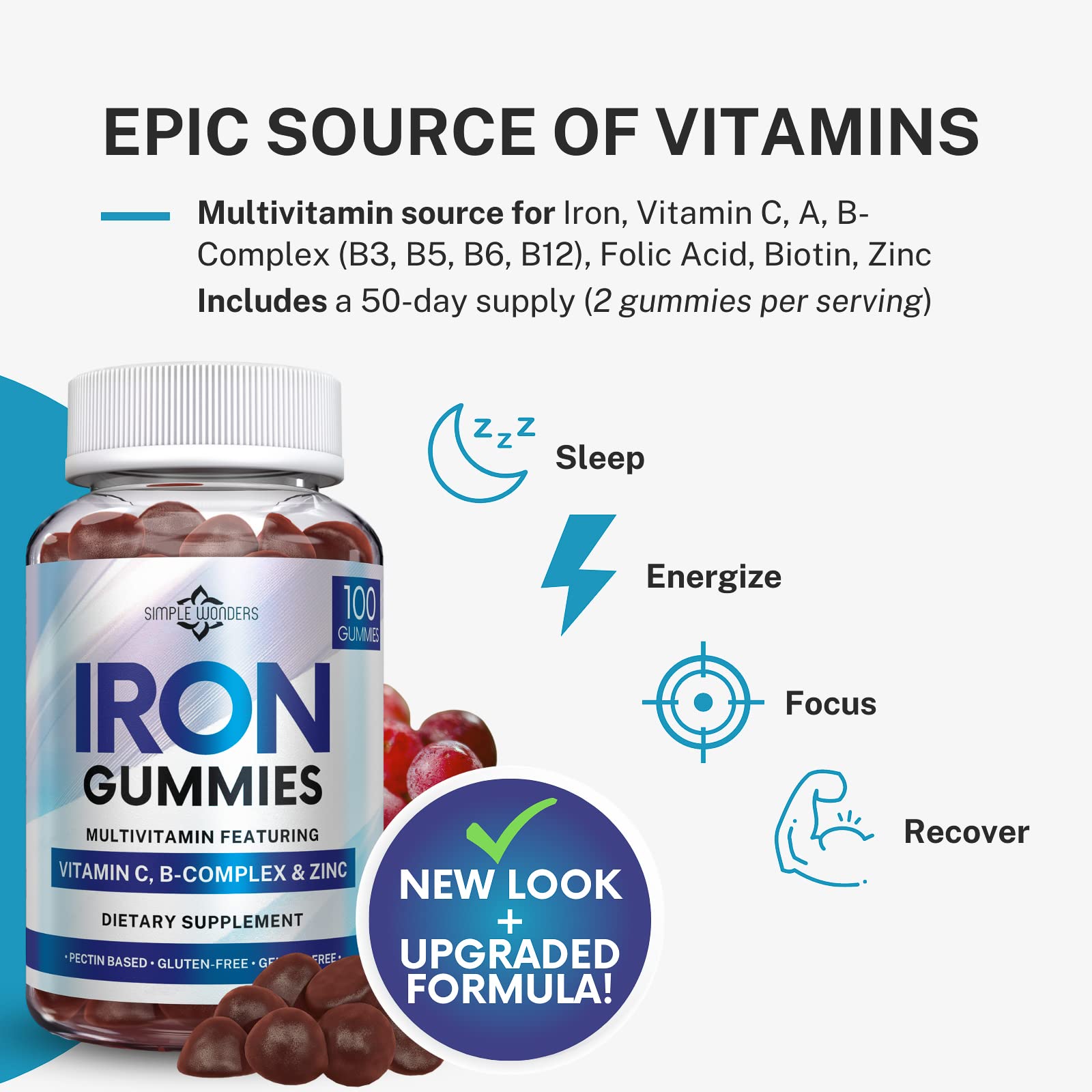 - Original Iron – Iron Gummies for Women, Men & Kids - Iron Supplement with Vitamin C, A, Vitamins B Complex, Biotin & Zinc - Multivitamin Chewable Iron Gummies for Adults - Alternative to Iron Pills, Capsules, Tablets by SIMPLE WONDERS