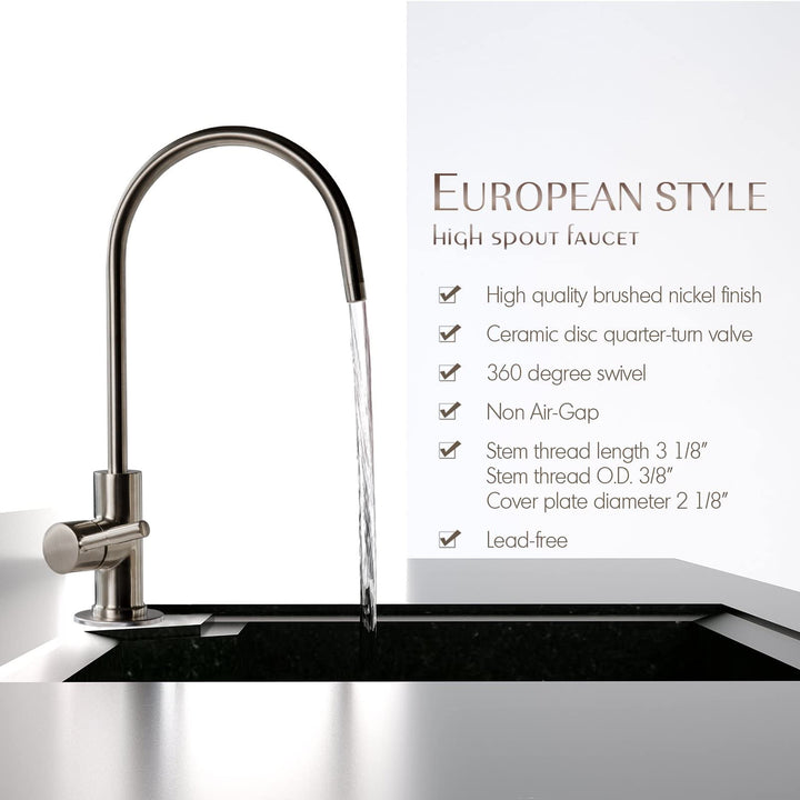 - Heavy duty non-air gap faucet with 360 degree free swivel and quarter turn handle; solid brass construction and durable ceramic disc provide trouble-free smooth operation. A safe channel for your freshly filtered water for you and your family.