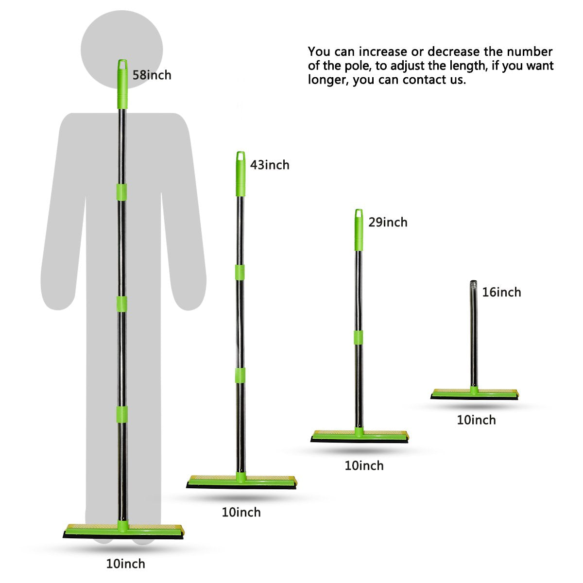 - Dimensions and Packing: The wide of the Window squeegee with extension pole is 10 inches and the length of the pole can reach up to 58 inches (4 section of poles), you can clean high windows. Package include 1 super absorbent sponge scrubber with mesh and natural rubber blade, four section of extension poles.Essential cleaning tool for every family and RV enthusiasts