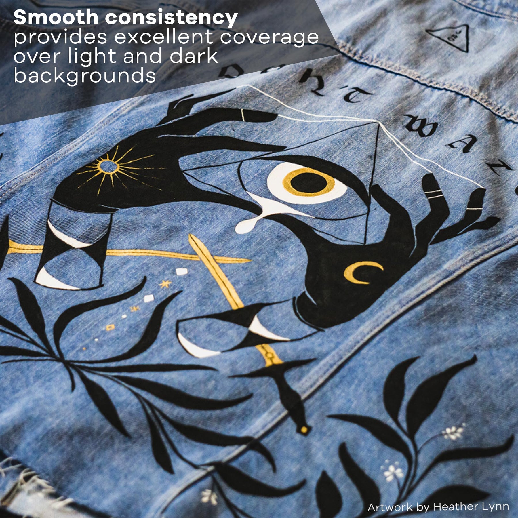 - Smooth Application - The light-bodied consistency of this metallic paint for metal and fabric is completely opaque. Create bold designs on both light or dark backgrounds or mix with other Jacquard products for different levels of transparency