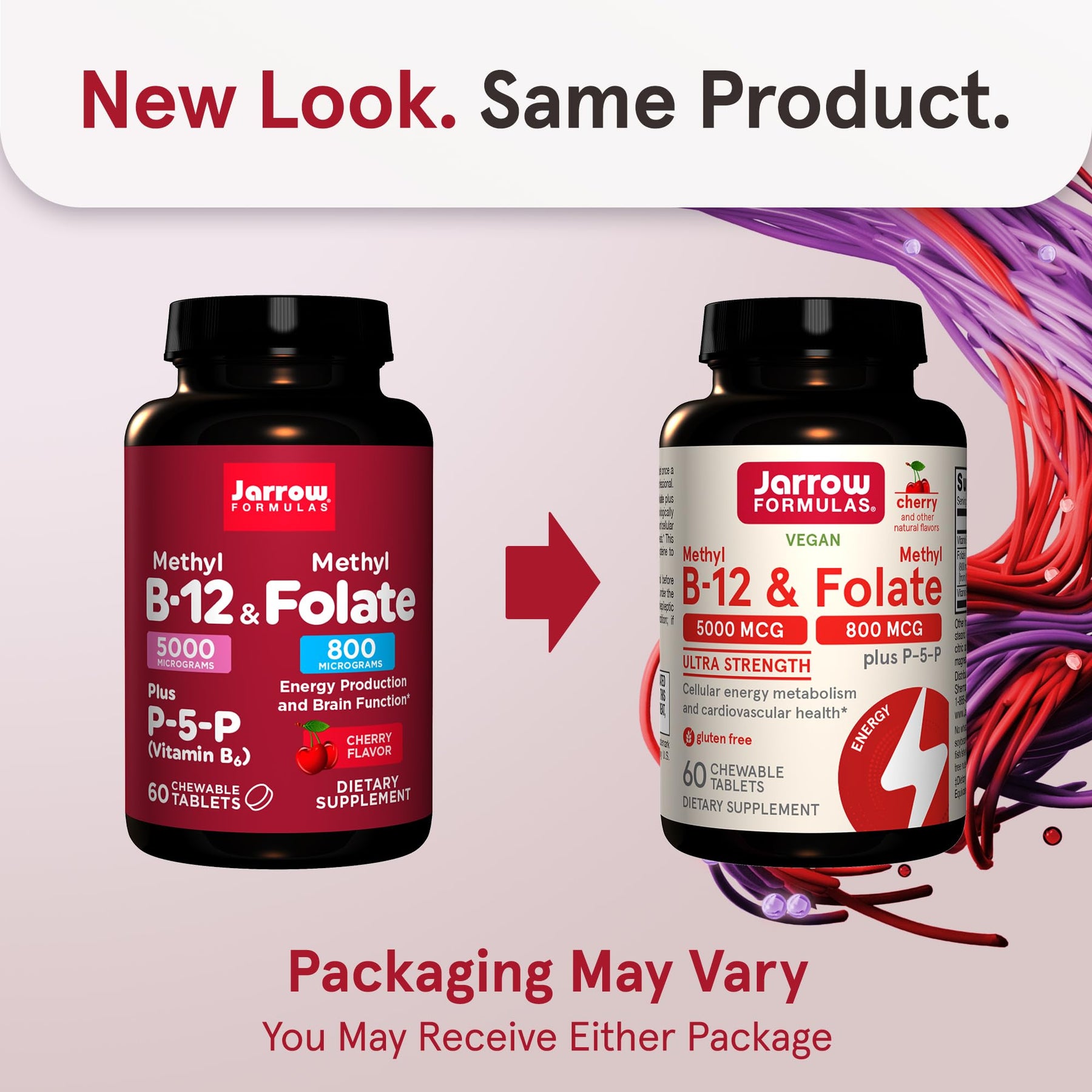 - Cellular Energy Metabolism and Cardiovascular support supplement*: Contains one 60 count bottle of Jarrow Formulas Ultra Strength Methyl B-12 5000mcg & Methyl Folate 800mcg Chewable Tablets for a 60-day supply.