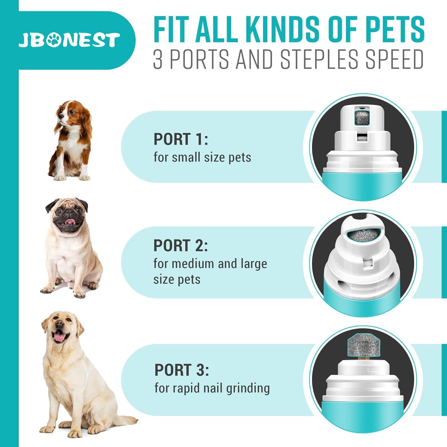 - FITS ALL KINDS OF PETS: Equipped with three ports and speed regulation switch, the nail grinder is widely applied to small, medium, large dogs or pets with different size nails.You can choose an appropriate way on pet's size and nail hardness for nails grinding.