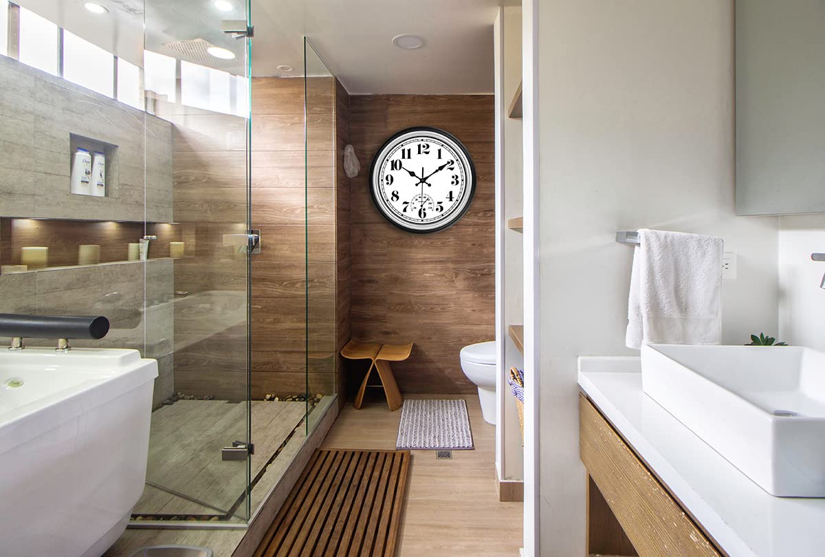 - Waterproof & Temperature You will love this outdoor wall clock with thermometer. It is waterproof and can be placed porch,patio,bathroom etc without worrying about get wet. If you are on the terrace, you can easily know the current time and temperature without going back to the house or looking at your phone.
