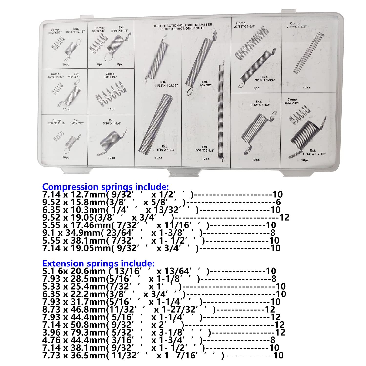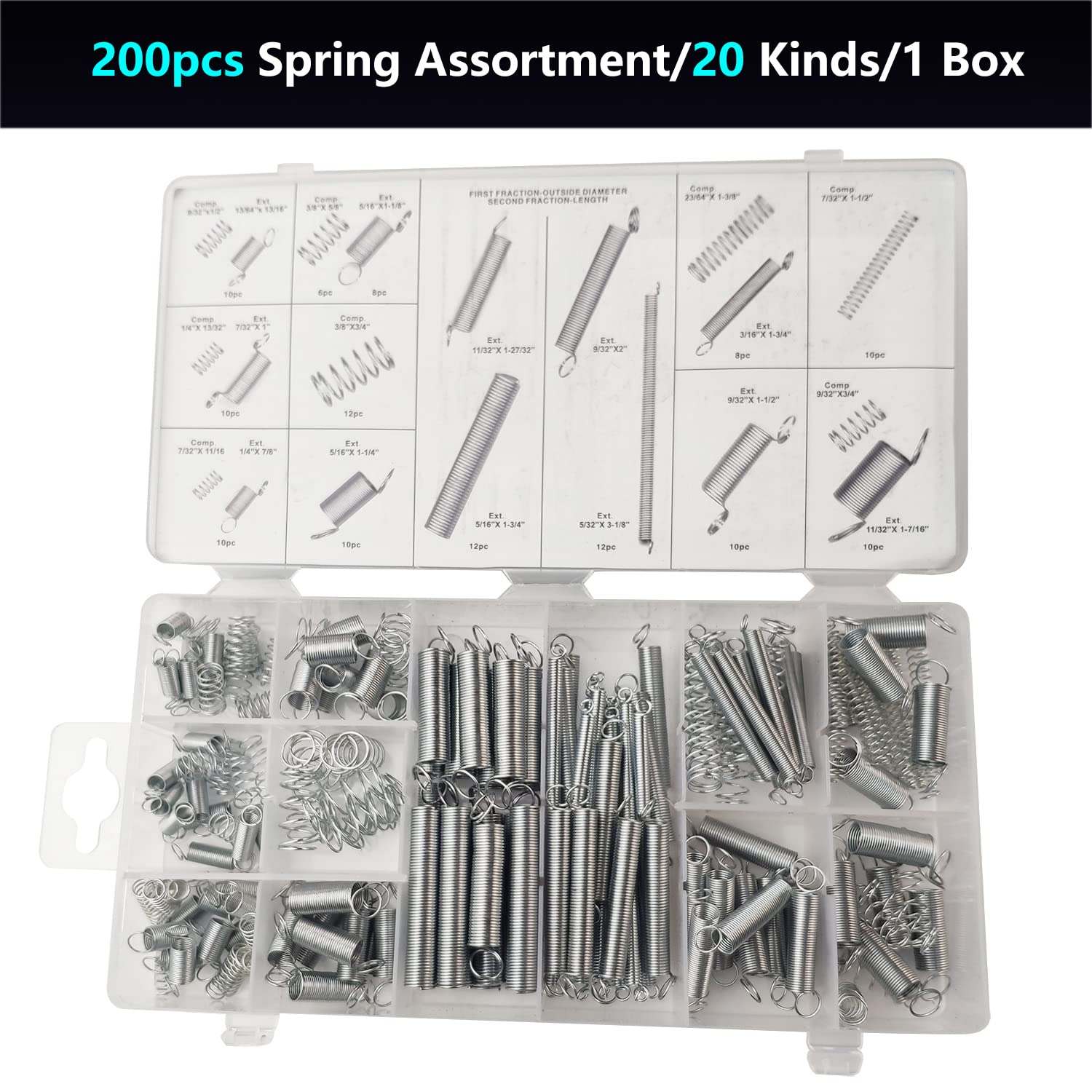 - [20 SIZES]: Compressions include 9/32 x 1/2, 1/4 x 13/32, 7/32 x 11/16 , 3/8x 5/8, 3/8 x 3/4,9/32 x 3/4, 23/64 x 1-3/8, 7/32 x 1-1/2. //// Extensions contain 13/64 x 13/16, 7/32 x 1, 1/4 x 7/8, 5/16 x 1-1/8,5/16 x 1-1/4, 5/16 x 1-3/4.Total 200pcs/1 box