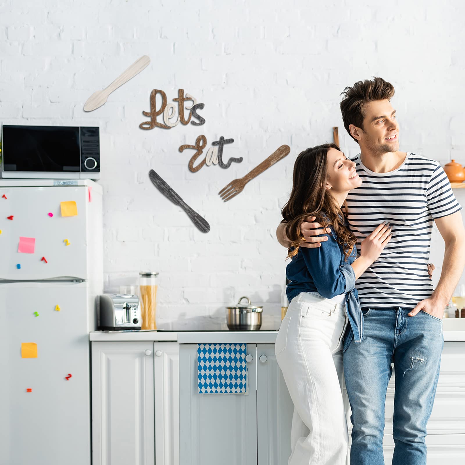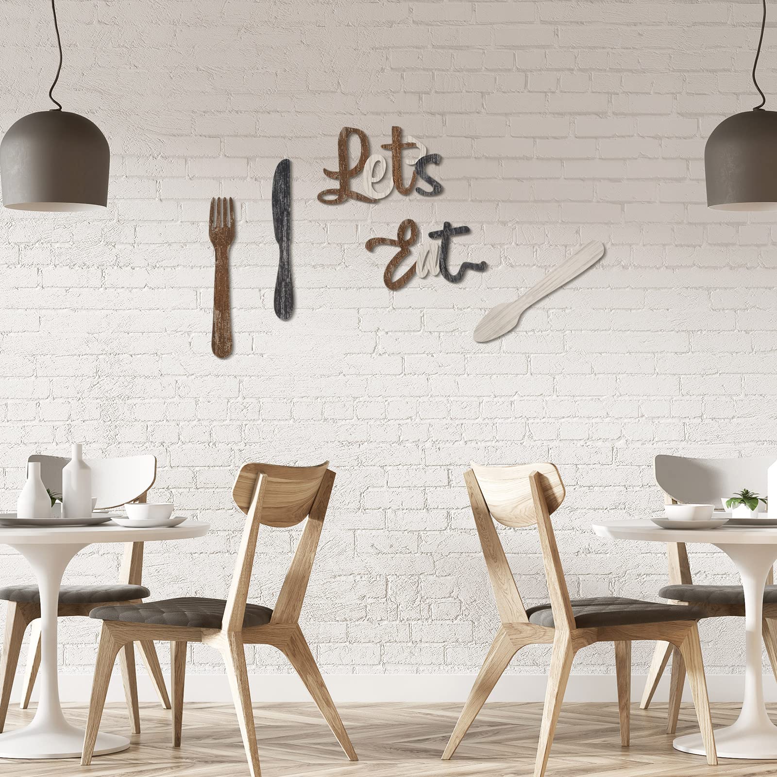 - Exquisite appearance: you will receive 5 piece of kitchen decor, including Let's and eat, a knife, a fork, and a spoon; Nice combination will bring you a nice using experience and become delicate decorations in your kitchen which combined rustic and modern feeling together, is sure to become a nice addition to your house