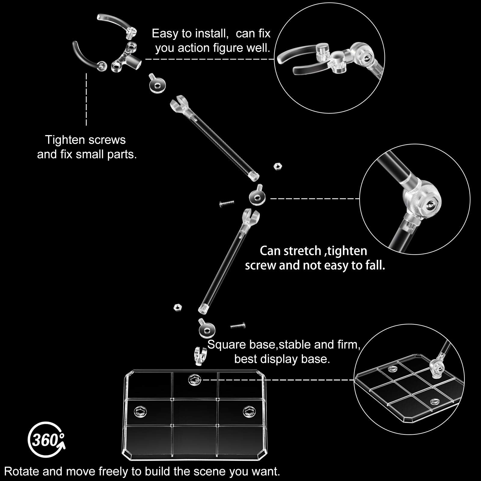 - Action figure stands set: there are 9 clear display holders compatible with movable models, which are designed to provide stable support for your action figures to stage, set up, stand, align, pose, or other actions. These model support stands can make your dolls show their charms well