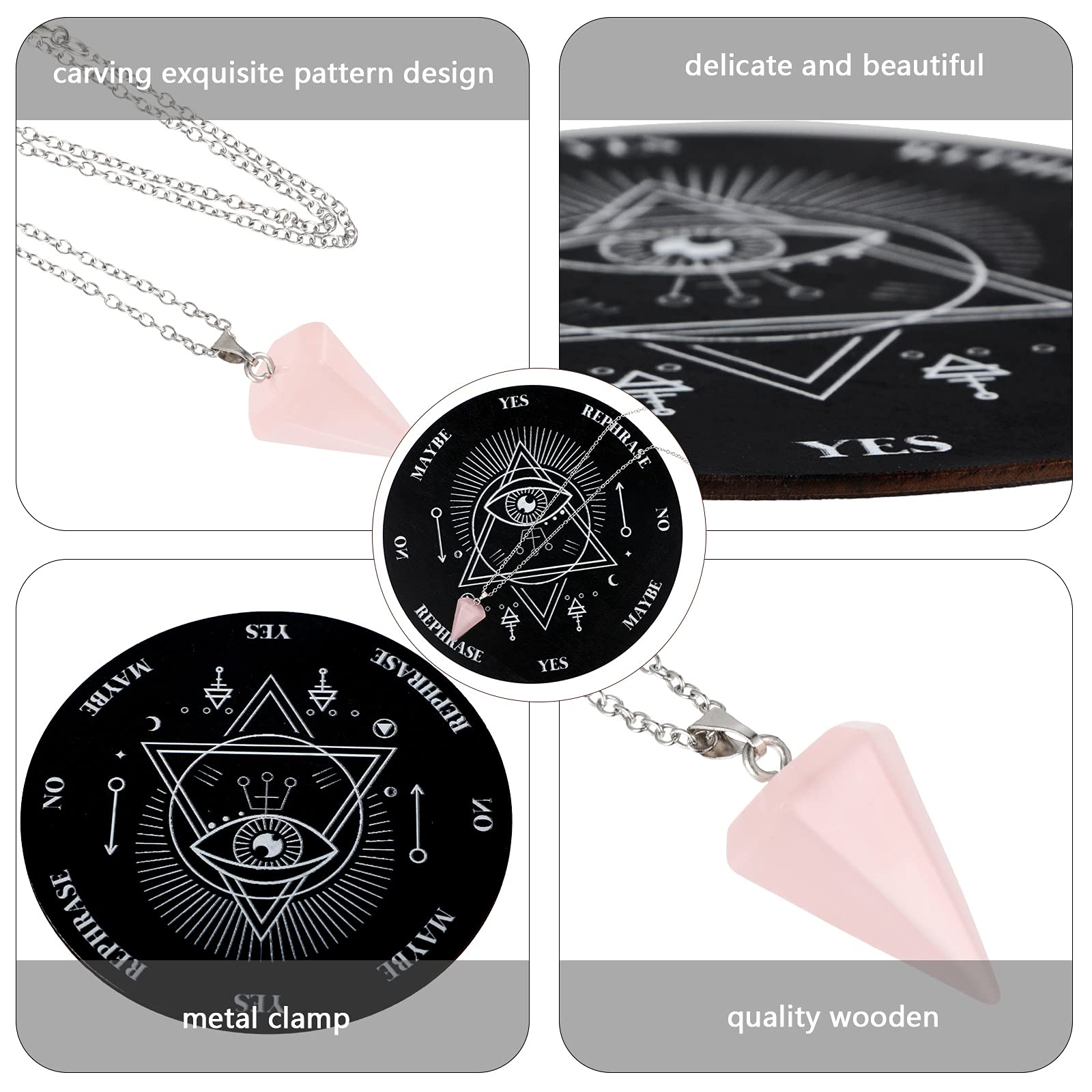 - Original Healing Crystals – Wooden Pendulum Board Dowsing Divination Pendulum Witchcraft Altar Supplies with Crystal Necklace and Wooden Pendulum Board Metaphysical Message Board Kit, 3.9 Inch(Black) by Jetec