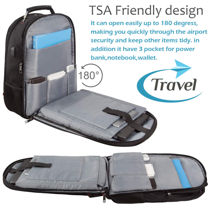 - TSA APPROVED & MULTIPURPOSE:At checkpoint,unfolds the EXTRA LARGE BACKPACK 0-180 degree making you quickly through the airport security and keep other items tidy,exclusive designed for AIRPLANE TRAVELING, fit under seat on airplane. It can be served as everyday backpack,spacious college bookbags backpack, professional backpack for laptop or daily use at anywhere for weekend getaway,occasional international travel, camping,business trips,hiking.