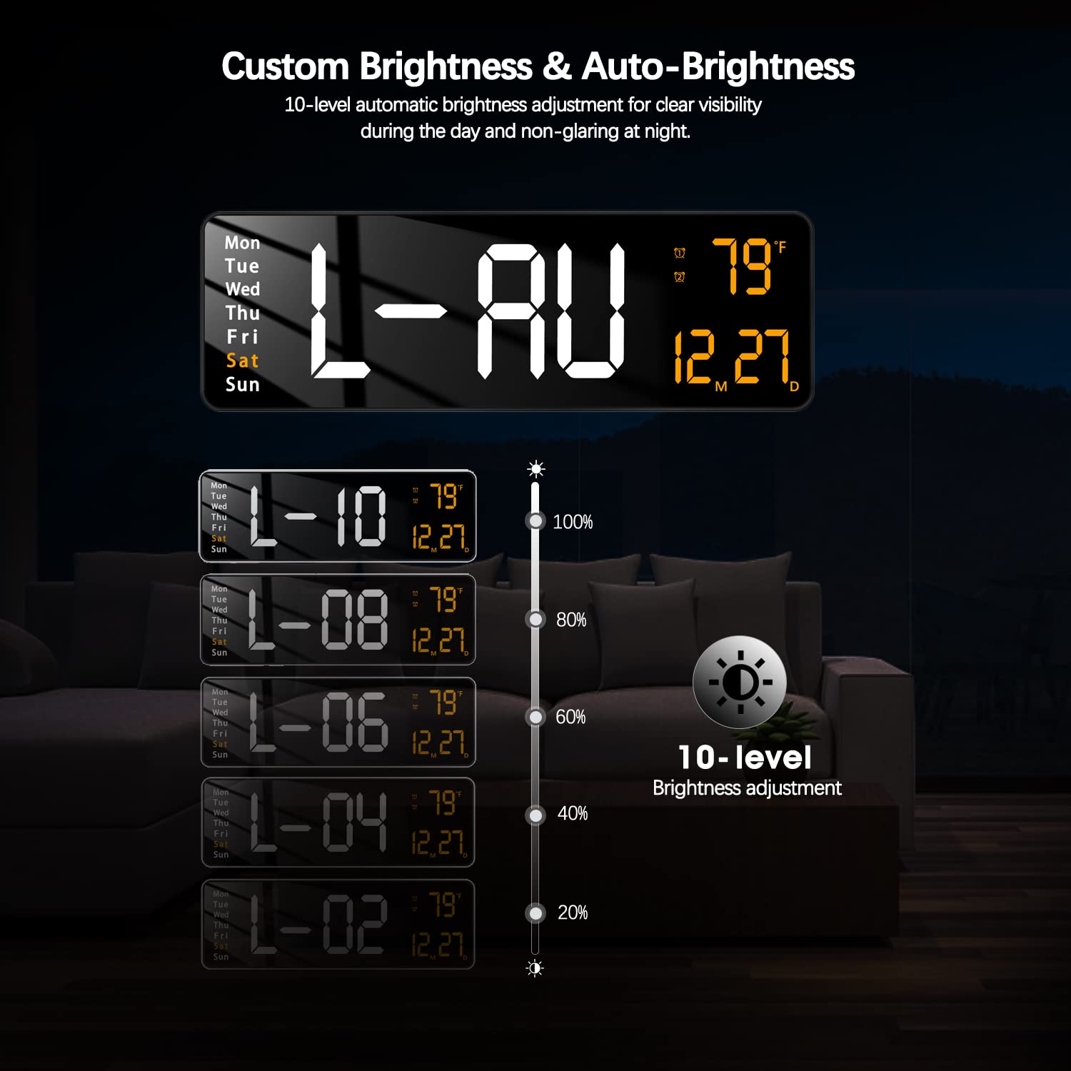 - AUTO/CUSTOM BRIGHTNESS DIMMER---This digital wall clock has a display with 10 levels of adjustable brightness. You can easily adjust it to your preferred level using the remote control. Plus, it has a built-in light sensor that automatically adjusts the brightness based on the ambient light in the room.