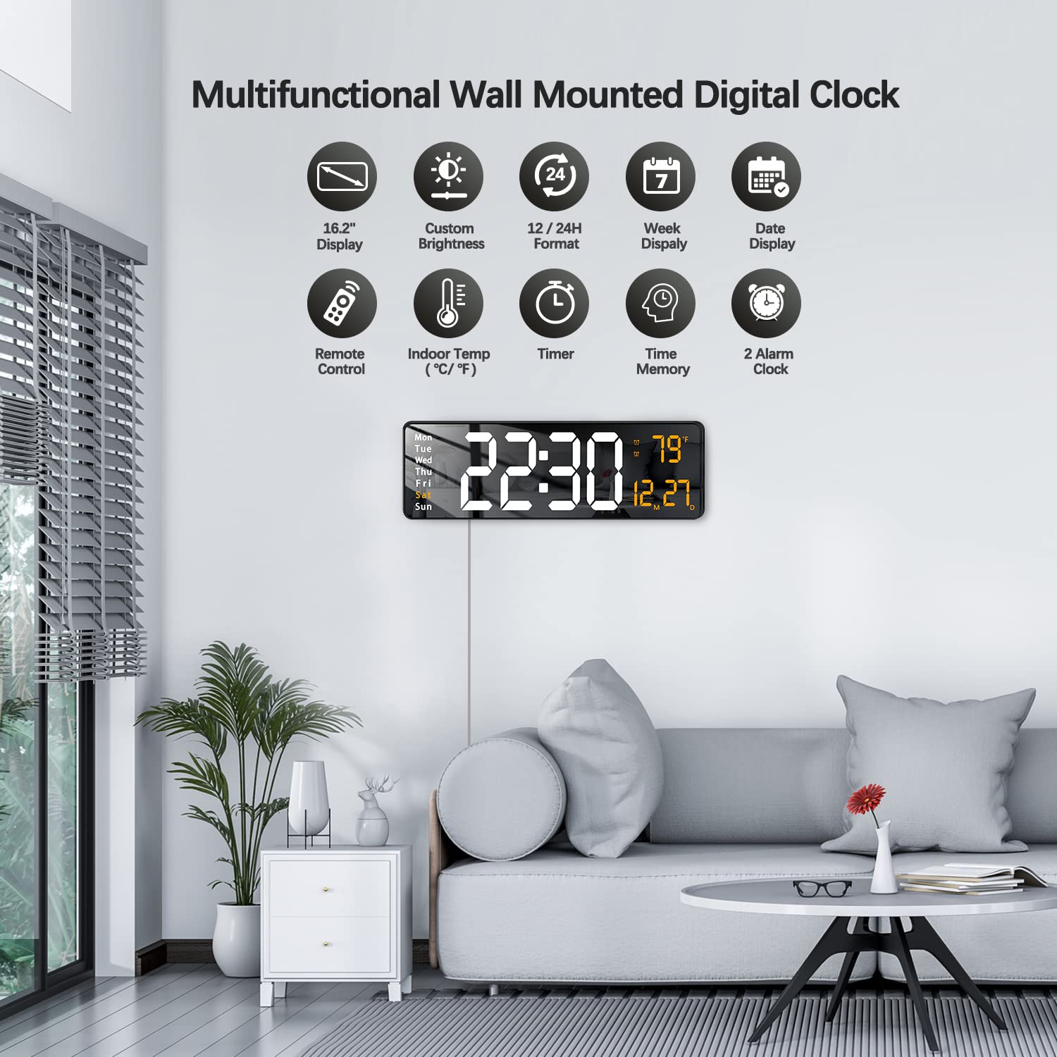 - MULTI-FUNCTION 16” DIGITAL LED WALL CLOCK---This digital LED wall clock has a large display screen with eye-catching LED digits that provide clear and comfortable visibility. You can easily read the time, no matter the time of day or night. It also has six modes: clock, date, week, temperature, alarm, and countdown timer. It's perfect for cooking in the kitchen, getting ready for the day, working out, teaching a class, and helping kids manage their time.