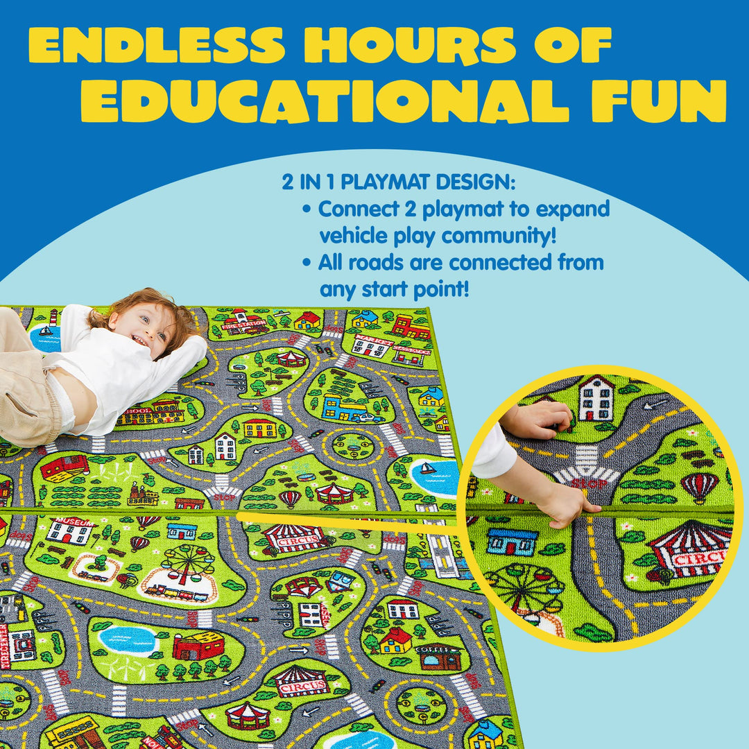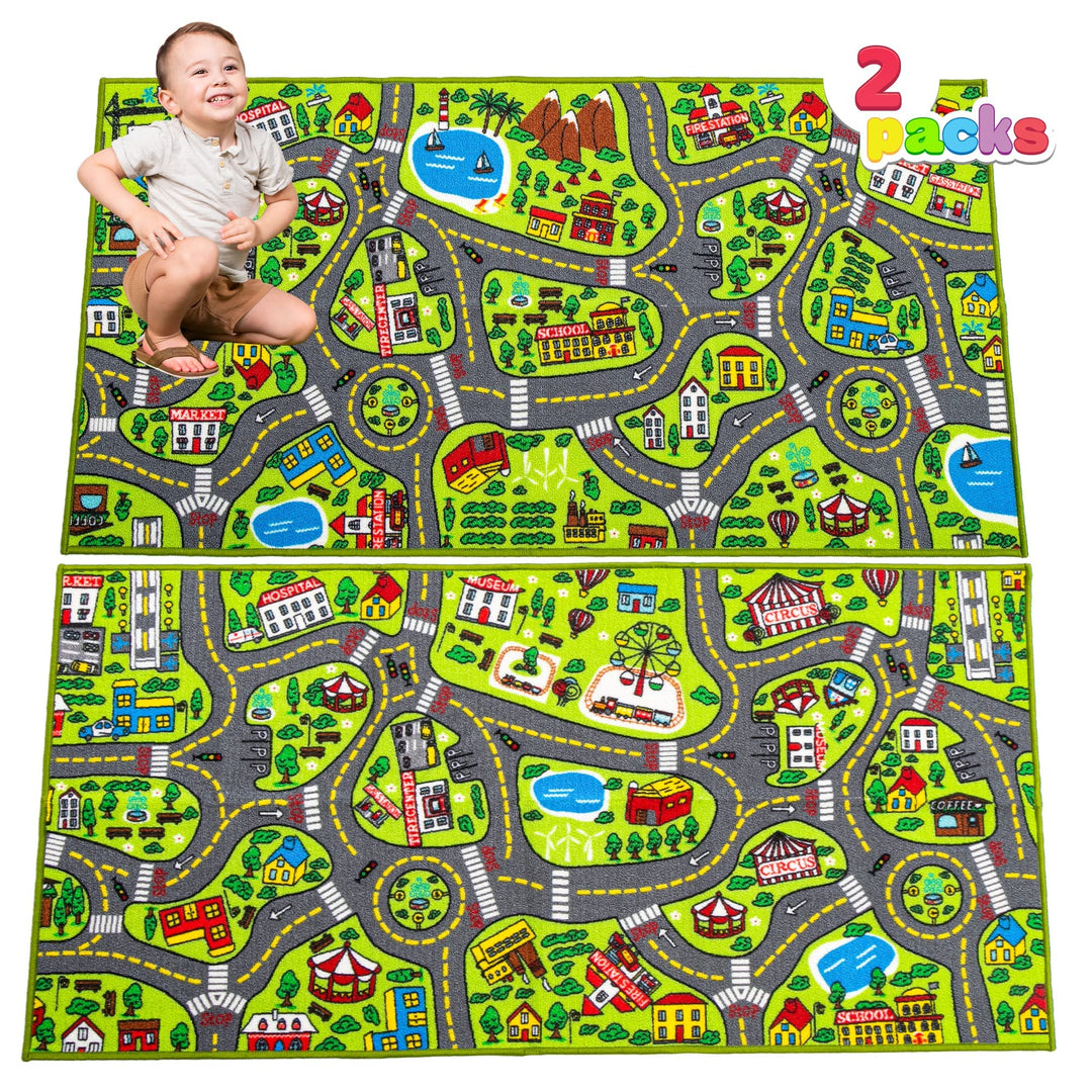 - COMPREHENSIVE SET. Playmat City Life Carpet Playmat includes two 58.5 x 31.5 carpet play mats .Each mat has different features and patterns This City Rug includes a Hospital, a School, a Airport and so much more! Connecting 2 playmat to expand Vehicle Play Community! All Roads are connected from any start point!