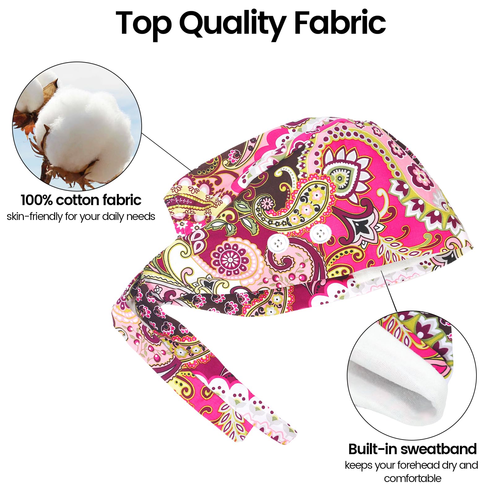 - Premium Quality:Our scrub caps made of 100% cotton top quality fabric,skin-friendly,breathable and comfortable for all day wearing.The surgical hats have diffenrent vivid colors for men and women.As a special bonus, each pack comes with 2 satin hair bands,adding an extra touch of style to your hair.