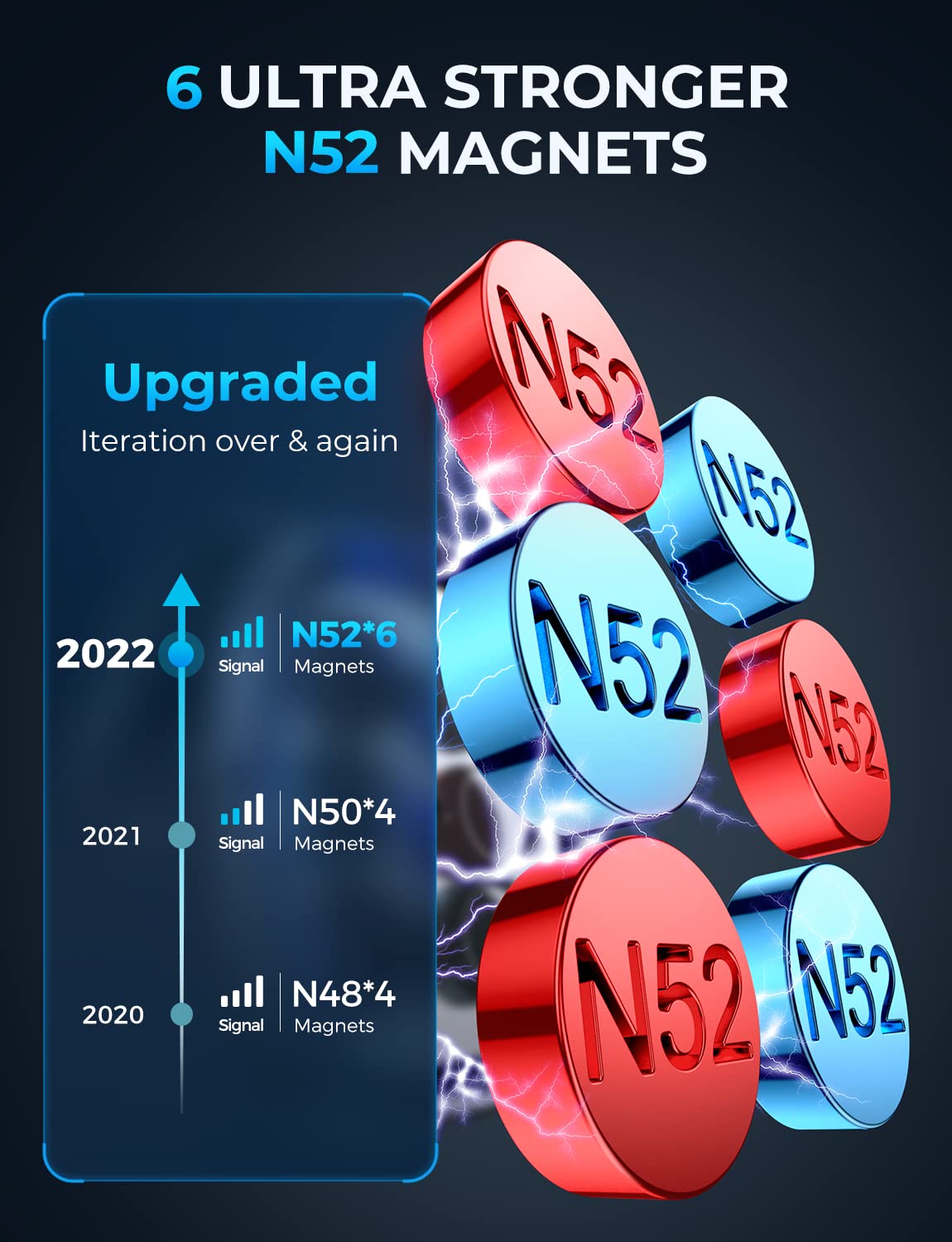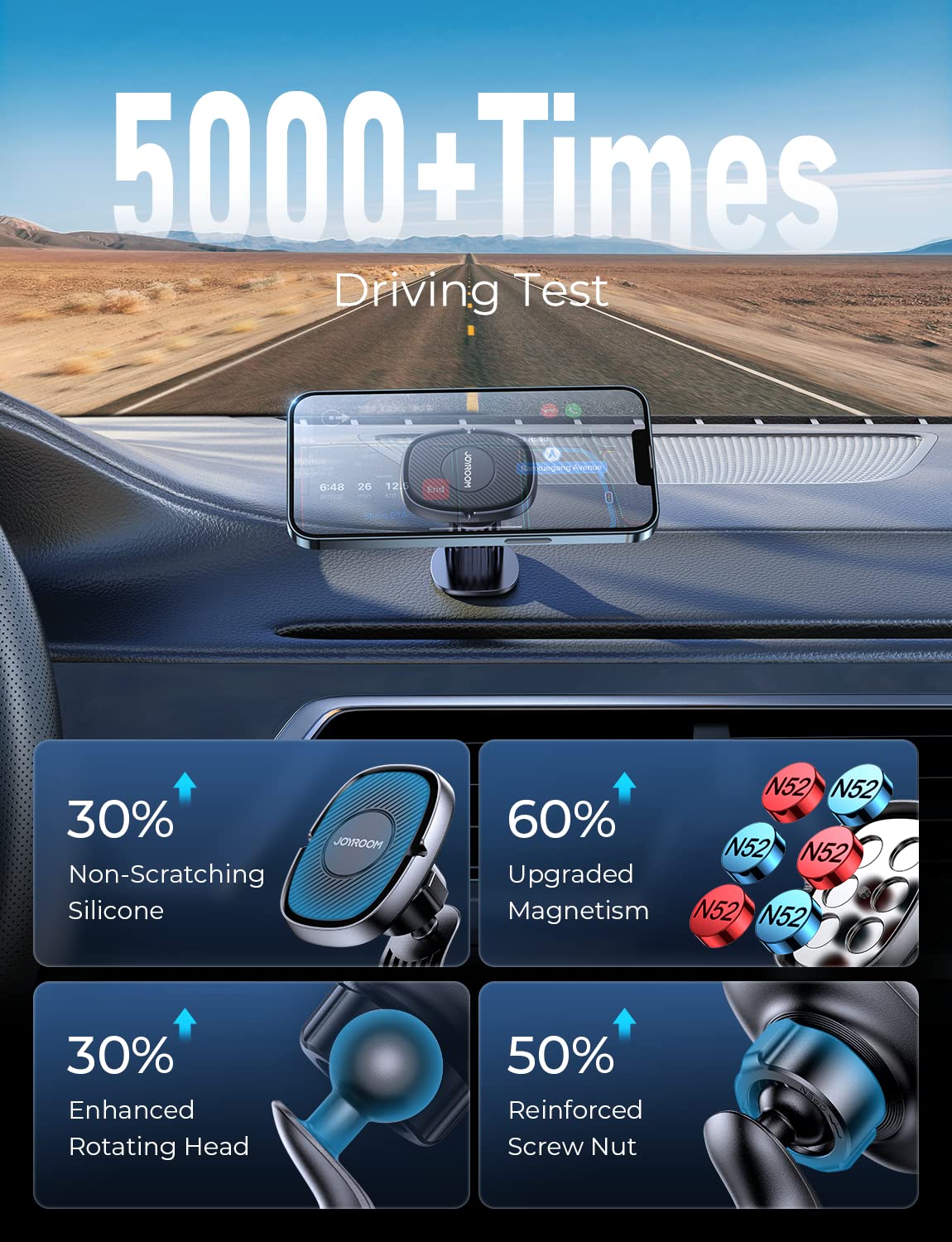 - [Holder Your Phone Firmly] Ultra N52 Magnetic *6,JOYROOM magnetic phone holder with 6 built-in strong magnets, this magnetic phone holder could hold your phone firmly even on the bumpiest road or sharper turn. You only need to take the phone close to the magnetic phone holder, and the phone will be swiftly attracted and sticks correctly to the mount in a snap-like click. Even if you are driving intently, you can easily put your phone on it.