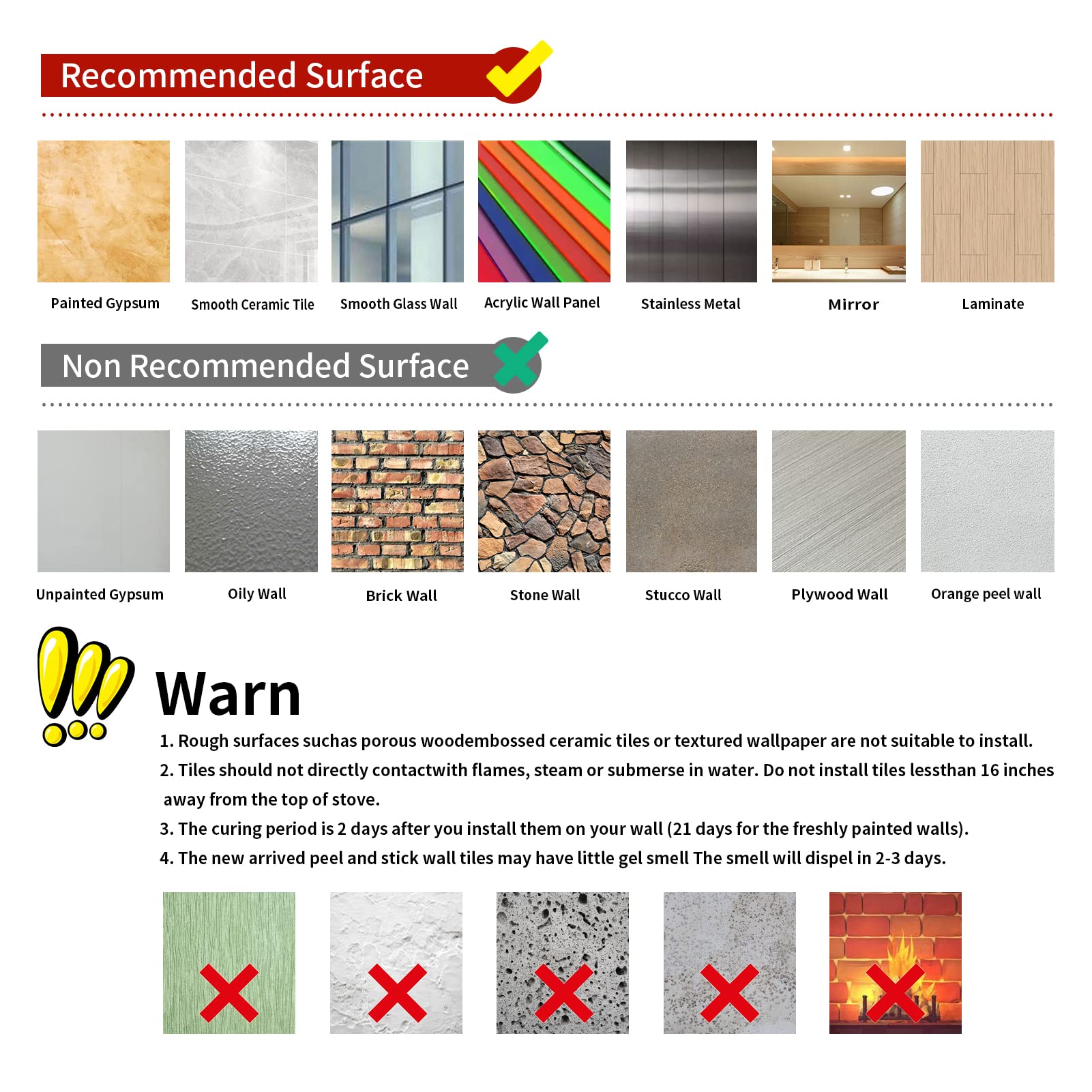 - 3:Material And AdvantagesEnvironmentally friendly vinyl material, The quality is better than most brands, strong adhesion, non-toxic, waterproof and oil-proof, easy to remove, will not leave any debris, will not damage the wall, and will not fade.Our advantage is that the pattern will not have color difference, other brands on the market have serious color difference, and the quality is very poor.