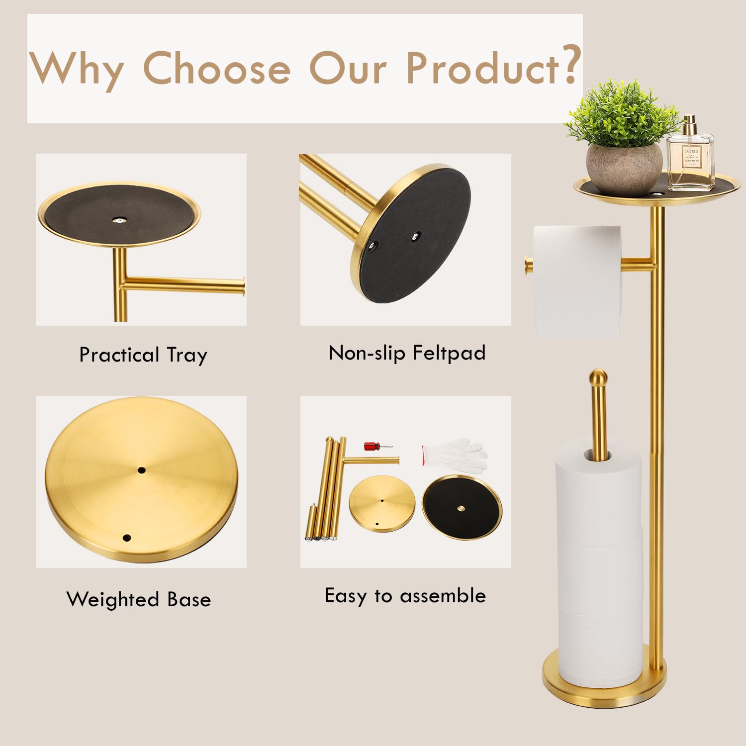 - SUS304 Stainless Steel Brushed Gold. The free standing toilet roll holder stand is made of premium 304 stainless steel material with elegant brushed gold finish, and will provide long lasting durability in the bathroom.