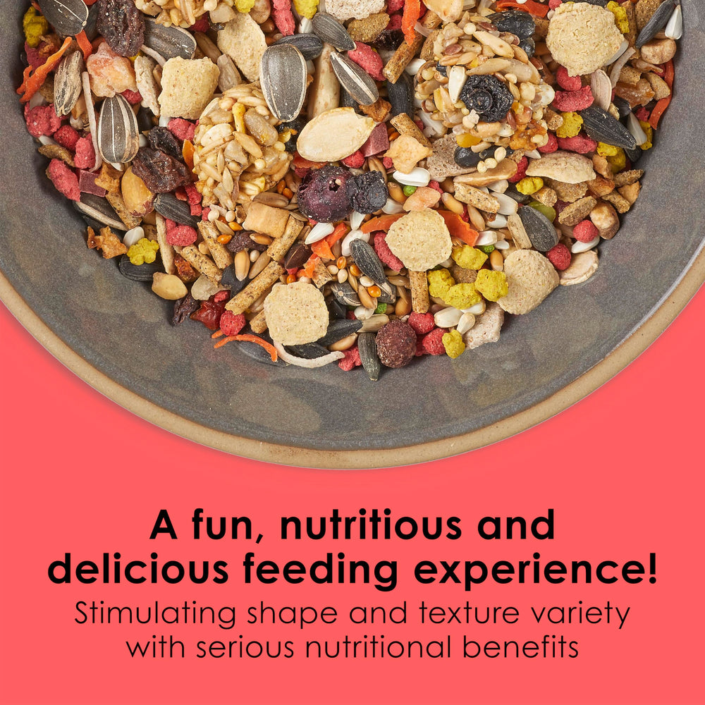 | ingredients | White Millet, Canary Grass Seed, Ground Corn, Safflower Seeds, Oat Groats, Sunflower Seed, Wheat, Red Millet, Calcium Carbonate, Dehulled Soybean Meal, Corn Gluten Meal, Flax Seed (Source of Omega-3), Shelled Peanuts, Buckwheat, Green Split Peas, Raisins, Wheat Middlings, Niger Seed, Dicalcium Phosphate, Soybean Oil, Ground Rice, Dried Papaya, Coconut, Cucumber Seed, Dehydrated Carrot, Pineapple, Dextrose, Apple, Salt, Dried Bell Peppers, Dried Molasses Beet Pulp, Corn Starch, Blueberries, L-Lysine Monohydrochloride, Wheat Germ Meal, Choline Chloride, Brewers Dried Yeast, Dried Whole Egg, Fructooligosaccharides, Hulled Sunflower Seeds, Peanut Pieces, Hulled Millet, Lignin Sulfonate, Hydrolyzed Yeast, Sun-cured Alfalfa Meal, Riboflavin Supplement, Vitamin B12 Supplement, Vitamin E Supplement, Titanium Dioxide (Color), Dried Cane Molasses, Technical Gelatin, DL-Methionine, Ferrous Sulfate, Milo, Zinc Oxide, Manganous Oxide, Niacin, Menadione Sodium Bisulfite Complex (Source of Vitamin K activity), Copper Sulfate, Citric Acid, Mixed Tocopherols (Preservative), Calcium Pantothenate, Vitamin A Acetate, Biotin, Cholecalciferol (Source of Vitamin D3), Pyridoxine Hydrochloride, Thiamine Mononitrate, Potassium Chloride, Manganese Proteinate, Honey, Rosemary Extract, L-Ascorbyl-2-Polyphosphate (source of Vitamin C), Folic Acid, Copper Proteinate, Yucca Schidigera Extract, Calcium Iodate, Cobalt Carbonate, Beta-Carotene (Color), Sodium Selenite, Canthaxanthin (Color), Dried Bacillus Licheniformis Fermentation Product, Dried Bacillus Subtilis Fermentation Product, Orange Oil, FD&C Red No. 40, FD&C Yellow No. 5, FD&C Blue No. 1. |