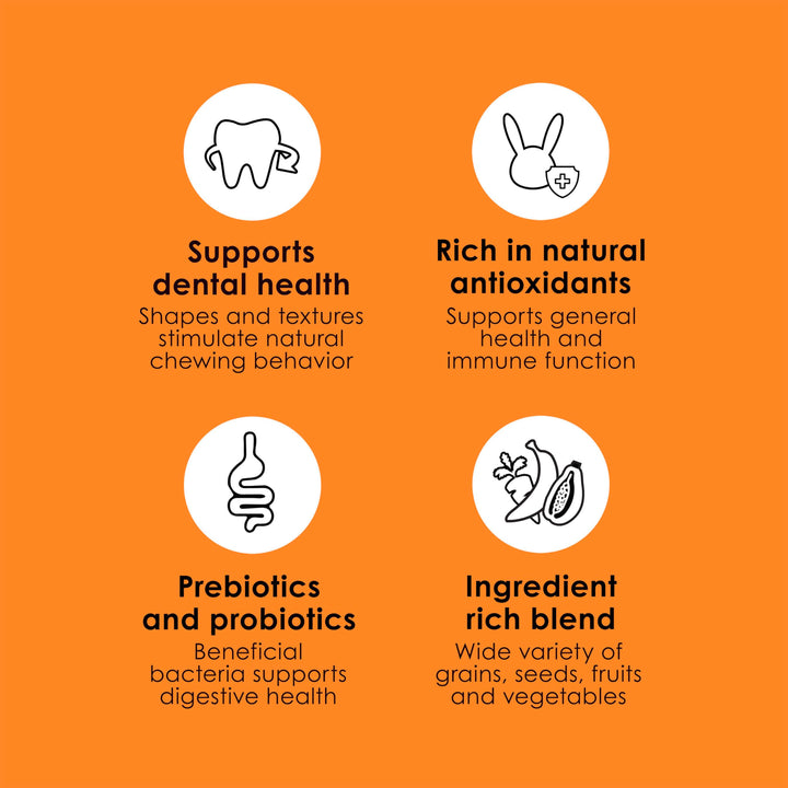 - SUPPORTS DENTAL HEALTH with a variety of shapes and textures, encouraging chewing activity