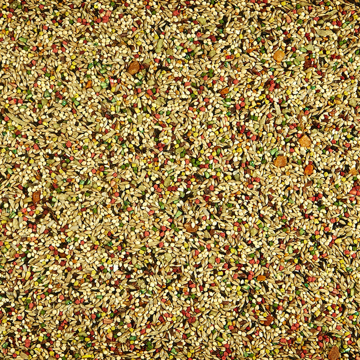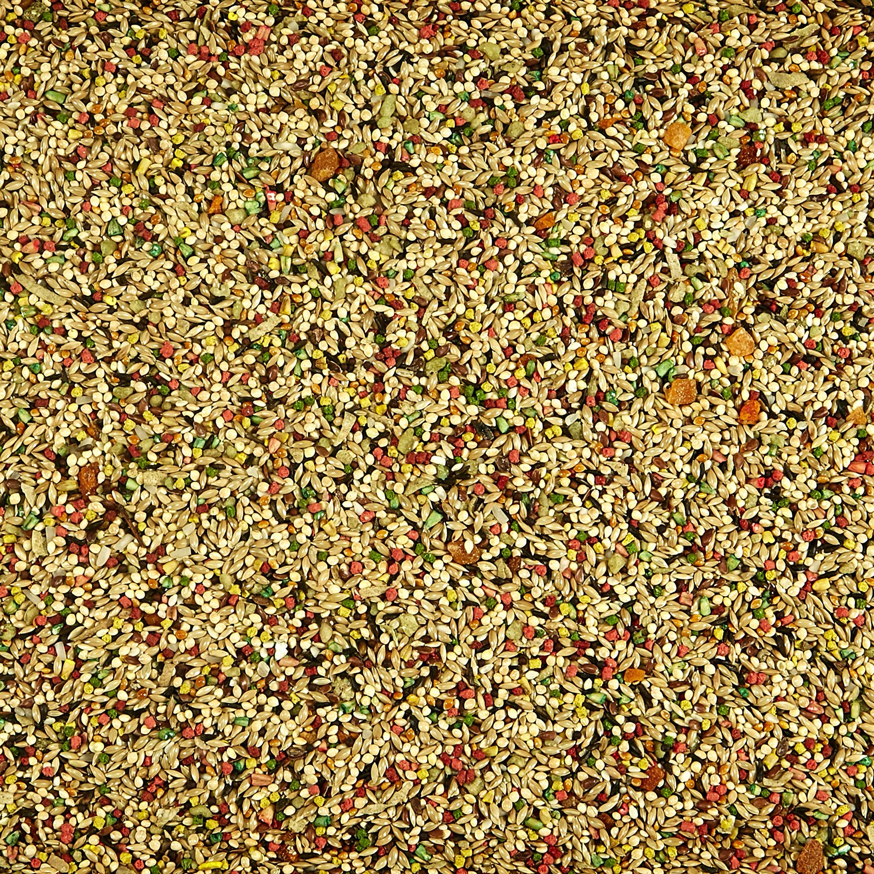 | ingredients | Canary Grass Seed, White Millet, Red Millet, Oat Groats, Canola Seed, Dried Papaya, Niger Seed, Flax Seed, Rice, Ground Corn, Calcium Carbonate, Dehulled Soybean Meal, Corn Gluten Meal, Ground Wheat, Dried Pineapple, Dried Mango, Coconut, Hulled Sesame Seed, Poppy Seed, Wheat Germ Meal, Wheat Middlings, Ground Oat Groats, Ground Flax Seed, Dried Molasses Beet Pulp, Soybean Oil, Dicalcium Phosphate, Sun-cured Alfalfa Meal, L-Lysine, Salt, Fructooligosaccharide, Dextrose, Brewers Dried Yeast, Vitamin A Supplement, Choline Chloride, Mixed Tocopherols (Preservative), Yeast Extract, DL-Methionine, Yucca Schidigera Extract, Vitamin E Supplement, Vitamin B12 Supplement, Riboflavin Supplement, Ferrous Sulfate, Zinc Oxide, Manganous Oxide, Manganese Proteinate, Copper Proteinate, Niacin, Menadione Sodium Bisulfite Complex (Source of Vitamin K activity), Rosemary Extract, Citric Acid, Cholecalciferol (Source of Vitamin D3), Calcium Pantothenate, Copper Sulfate, Thiamine Mononitrate, Pyridoxine Hydrochloride, Beta-Carotene, Canthaxanthin (Color), Folic Acid, Calcium Iodate, Biotin, Cobalt Carbonate, Sodium Selenite, Dried Bacillus subtilis Fermentation Product, Dried Bacillus licheniformis Fermentation Product, FD&C Yellow #5, FD&C Red #40, FD&C Blue #1, Artificial and Natural Flavors. |