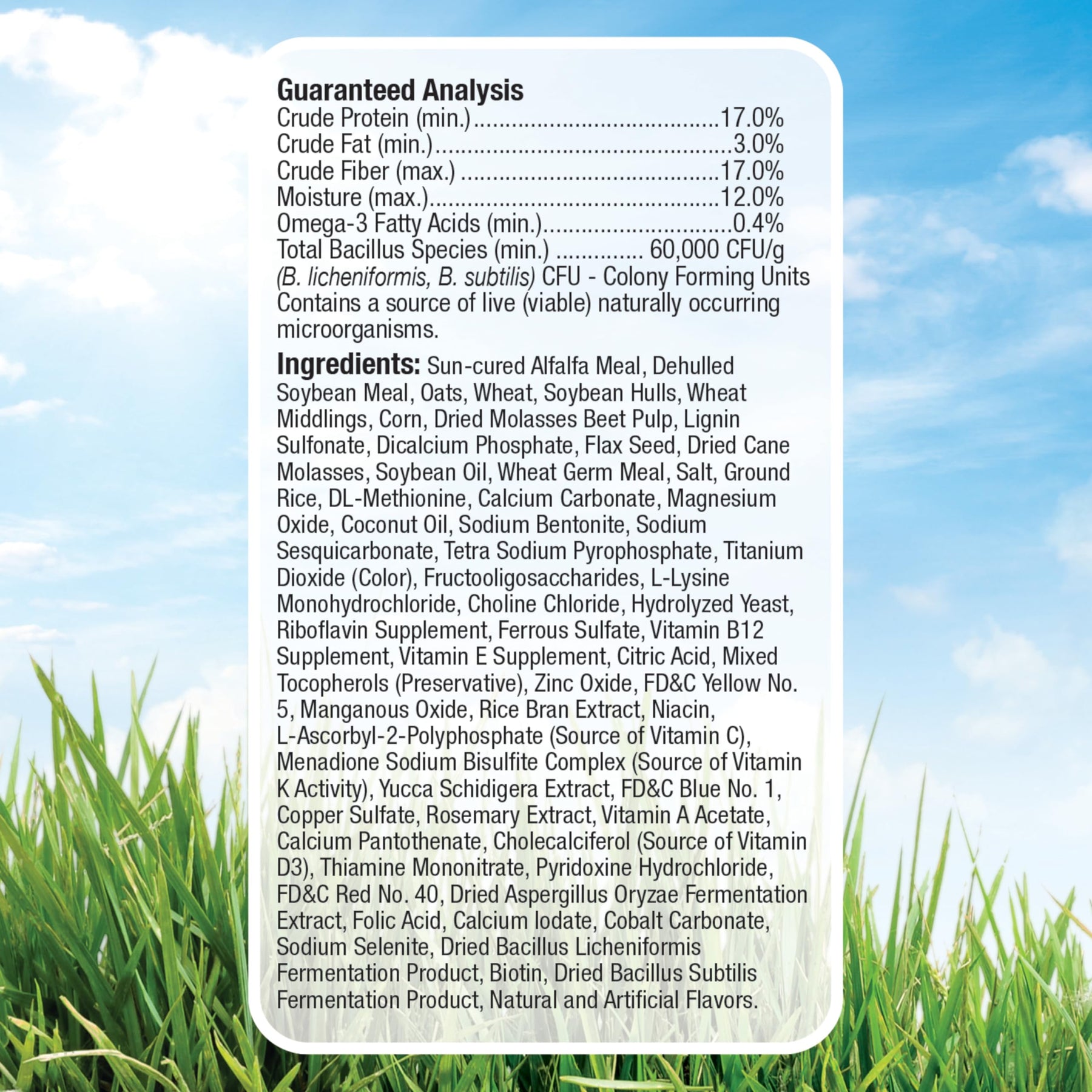 | ingredients | Sun-cured Alfalfa Meal, Dehulled Soybean Meal, Ground Oats, Ground Wheat, Wheat Middlings, Ground Corn, Ground Oat Hulls, Dried Molasses Beet Pulp, Ground Flax Seed (source of Omega-3), Dicalcium Phosphate, Dried Cane Molasses, Soybean Oil, Wheat Germ Meal, Salt, Ground Rice, DL-Methionine, Calcium Carbonate, Coconut Oil, Magnesium Oxide, Vitamin A Supplement, Choline Chloride, Fructooligosaccharide, Tetra Sodium Pyrophosphate, Sodium Bicarbonate, Titanium Dioxide (Color), Sodium Bentonite, L-Lysine, Yeast Extract, Mixed Tocopherols (a preservative), Yucca Schidigera Extract, Riboflavin Supplement, Vitamin B12 Supplement, Vitamin E Supplement, Ferrous Sulfate, Manganous Oxide, Zinc Oxide, Niacin, Menadione Sodium Bisulfite Complex (source of Vitamin K activity), Copper Sulfate, L-Ascorbyl-2-Polyphosphate (source of Vitamin C), Rosemary Extract, Citric Acid, Calcium Pantothenate, Cholecalciferol (source of vitamin D3), Pyridoxine Hydrochloride, Thiamine Mononitrate, Folic Acid, Calcium Iodate, Biotin, Cobalt Carbonate, Sodium Selenite, Dried Aspergillus oryzae Fermentation Extract (source of Protease), Dried Bacillus licheniformis Fermentation Product, Dried Bacillus subtilis Fermentation Product, Natural Flavor, FD&C Yellow #5, FD&C Blue #1, FD&C Red #40 |