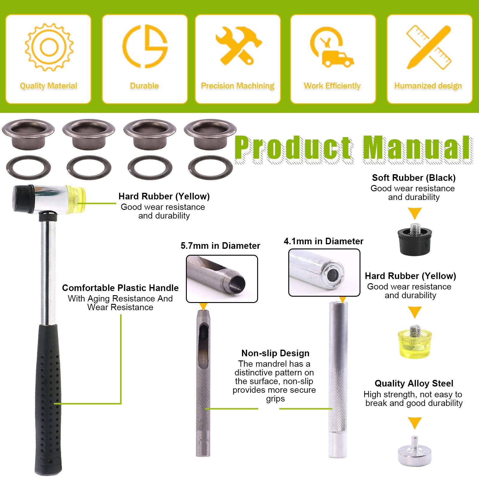 - WHAT YOU GET In this grommet tools kit, you will get 200 pieces 1/4 inch black grommets eyelets and 200 pieces washers, 1 piece hole punch cutter, 1 piece grommets setting fastener tool and 1 piece double heads rubber hammer with 1 pair of hammer head replacement. Ideal for your various leather DIY projects.