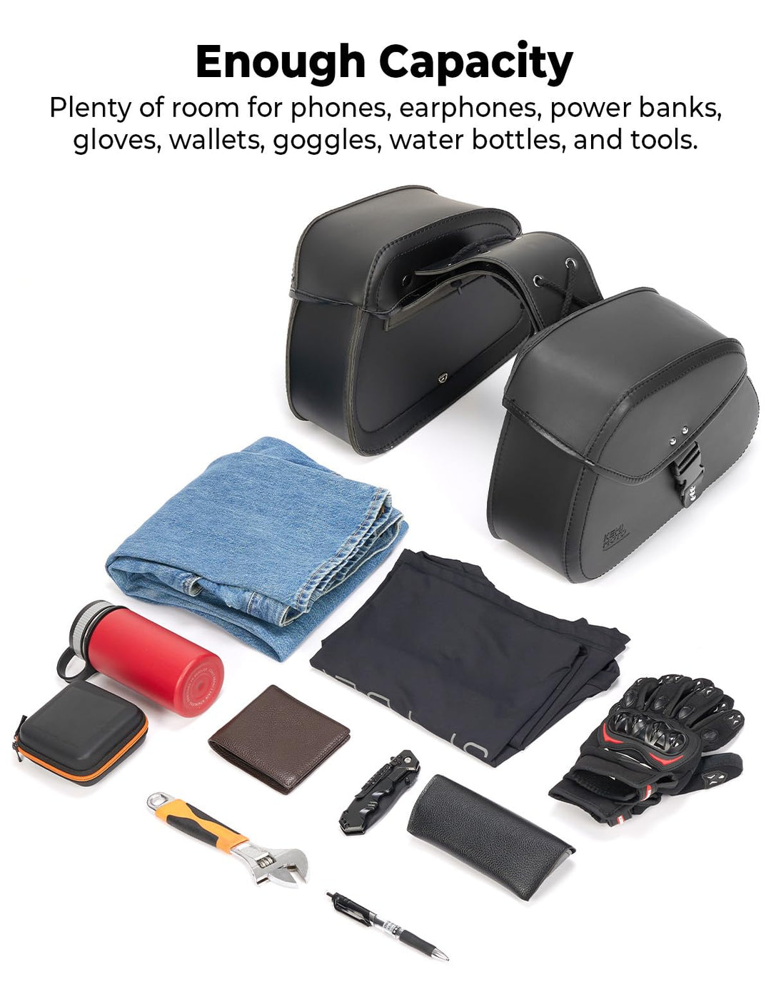 - Enough Capacity for Daily NeededSaddlebags for motorcycles size is 11.6 *4.5 *9.8 inches. Enough room to store some regular stuff. Such as Cups, Drinks, Gloves, Wallets, Earphones, Power Banks, Raincoats, Tools, or other daily necessities to meet your demands for commuting and short vacations.