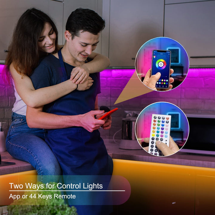 - Timer Mode & Multi-Control LED lights can be controlled by App and 44 keys remote control. Through a stable Bluetooth connection, you can use APP to change the color and brightness of the bedroom, kitchen, and living room. You can also set a schedule through the timer function to wake up your new mood with your favorite color in the early morning.