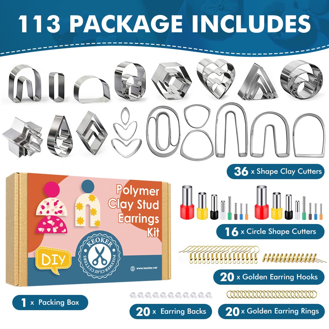 - One set meets all neeedsKeoker polymer clay cutters set include 36pcs shape clay cutters, 16pcs circle shape cutters, 20pcs golden earring hooks, 20pcs earring backs, 20pcs golden earring rings.