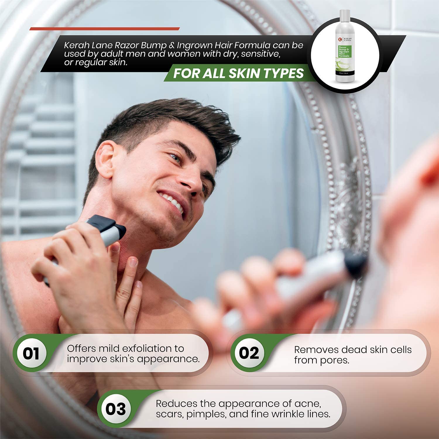 - FOR ALL SKIN TYPES: Kerah Lane Razor Bump & Ingrown Hair Formula can be used by adult men and women with dry, sensitive, or regular skin. It has a pleasant scent and is safe for use on armpits, pubic area, bikini, face, legs, neck, chins, and more.