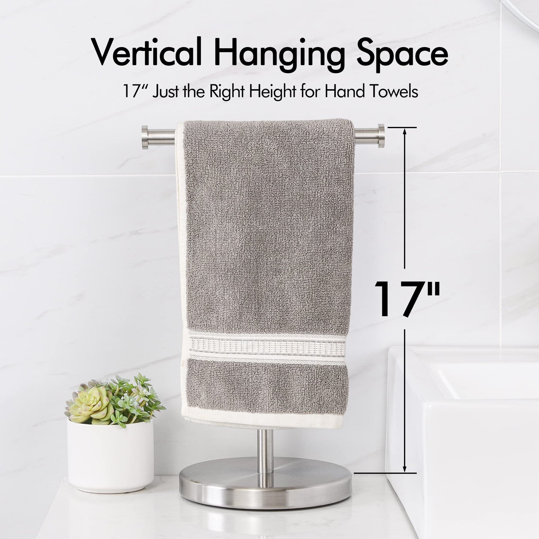 - Improved Design: Vertical hanging space is 17 (432mm), which is tall enough for a normal hand towel to hang and not touch the counter. The horizontal hanging width is 10.5 (266mm), suitable for standard towels (MAX. Length is 31). NOTE: Please measure the size of your counter area where you need to put the product before purchasing.