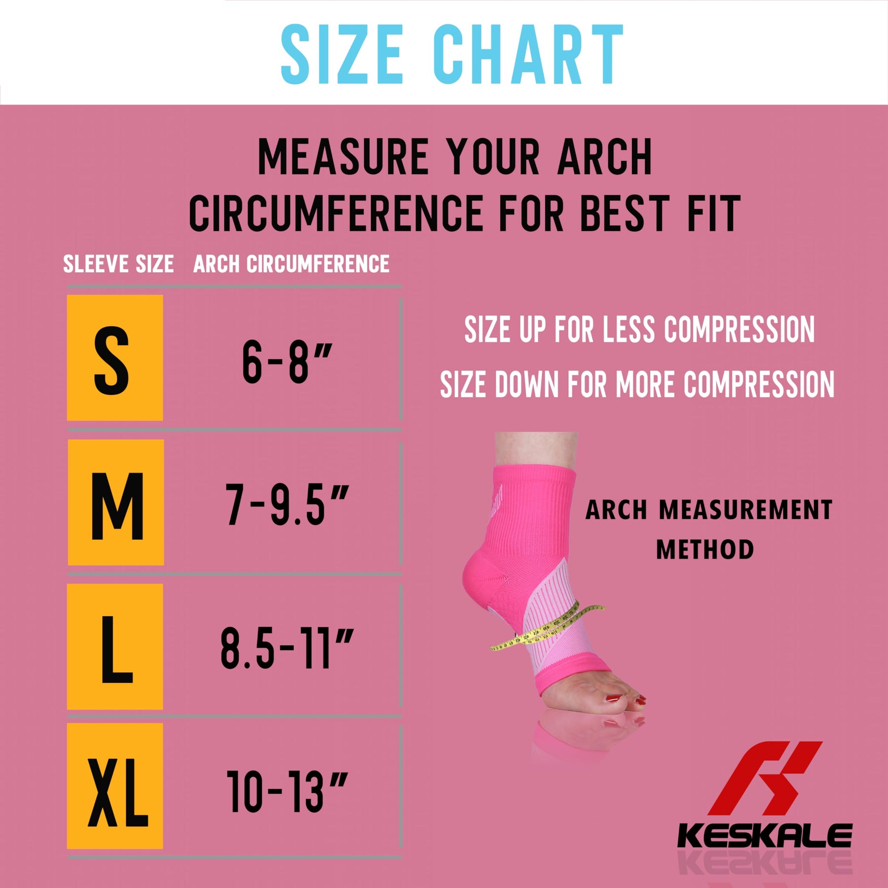 - To ensure the best fit, measure your arch circumference and select the appropriate size ankle compression sleeve according to the size chart provided (2# image). We recommended those who do not want strong compression to purchase the next size up due to our real 20-30mmHg compression grade.