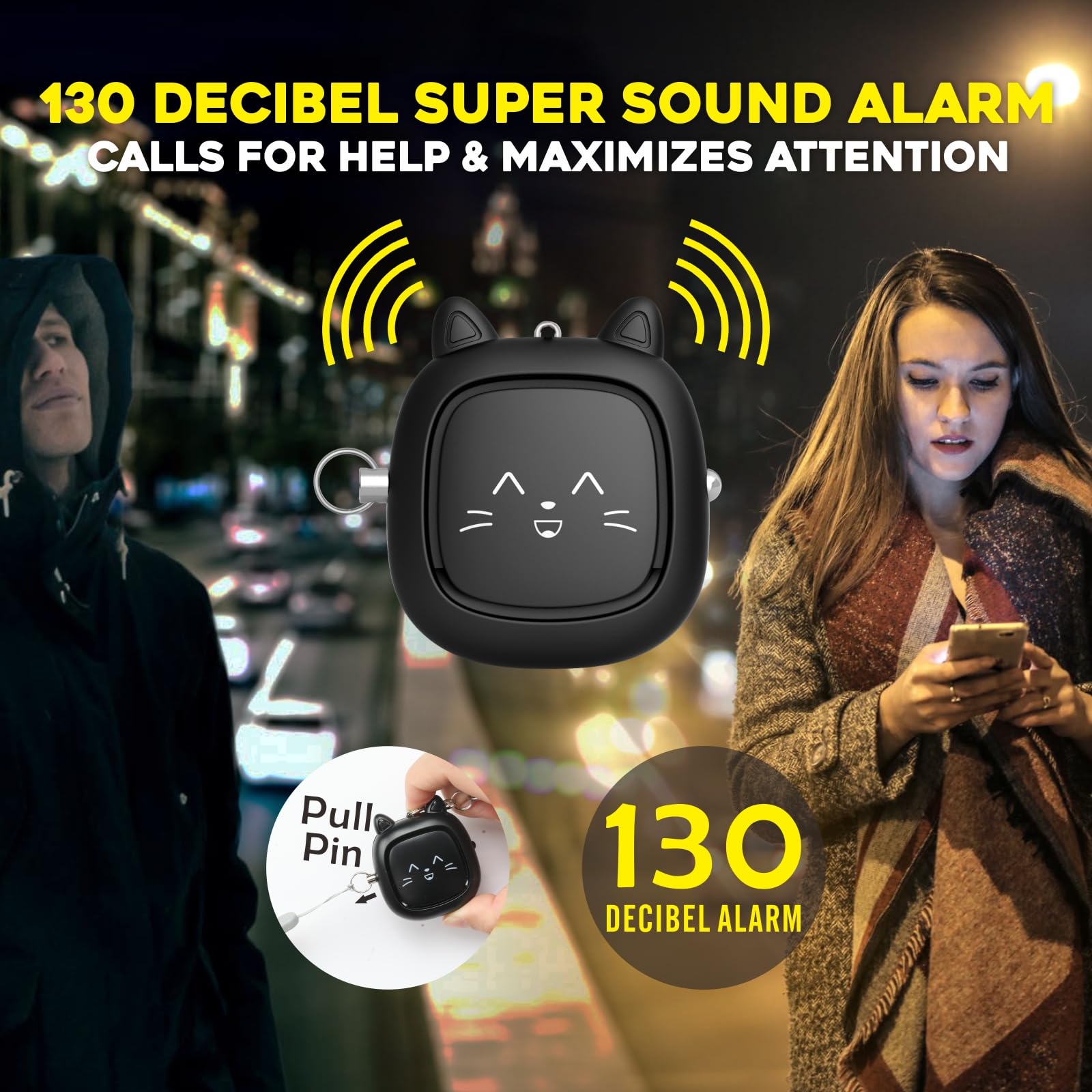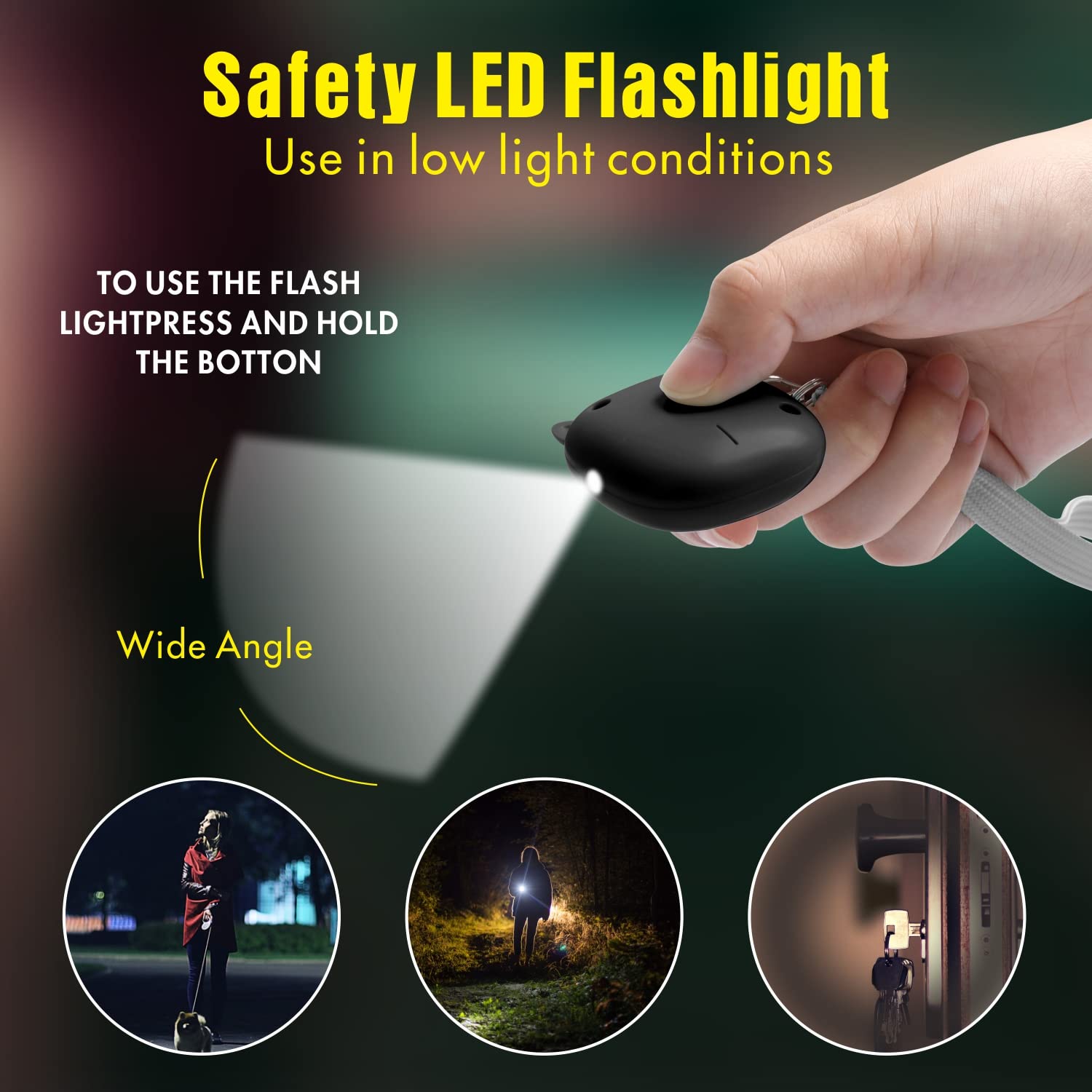 - [130 dB EMERGENCY ALARM] The personal security alarm emitting 130 decibels of noise can significantly disorient anyone around it, especially when people are not expecting it. In addition to using when out alone, this emergency alarm comes with LED lights for those not-so-well-lit areas. You can use it to find keys in your handbag or the lock on the front door.