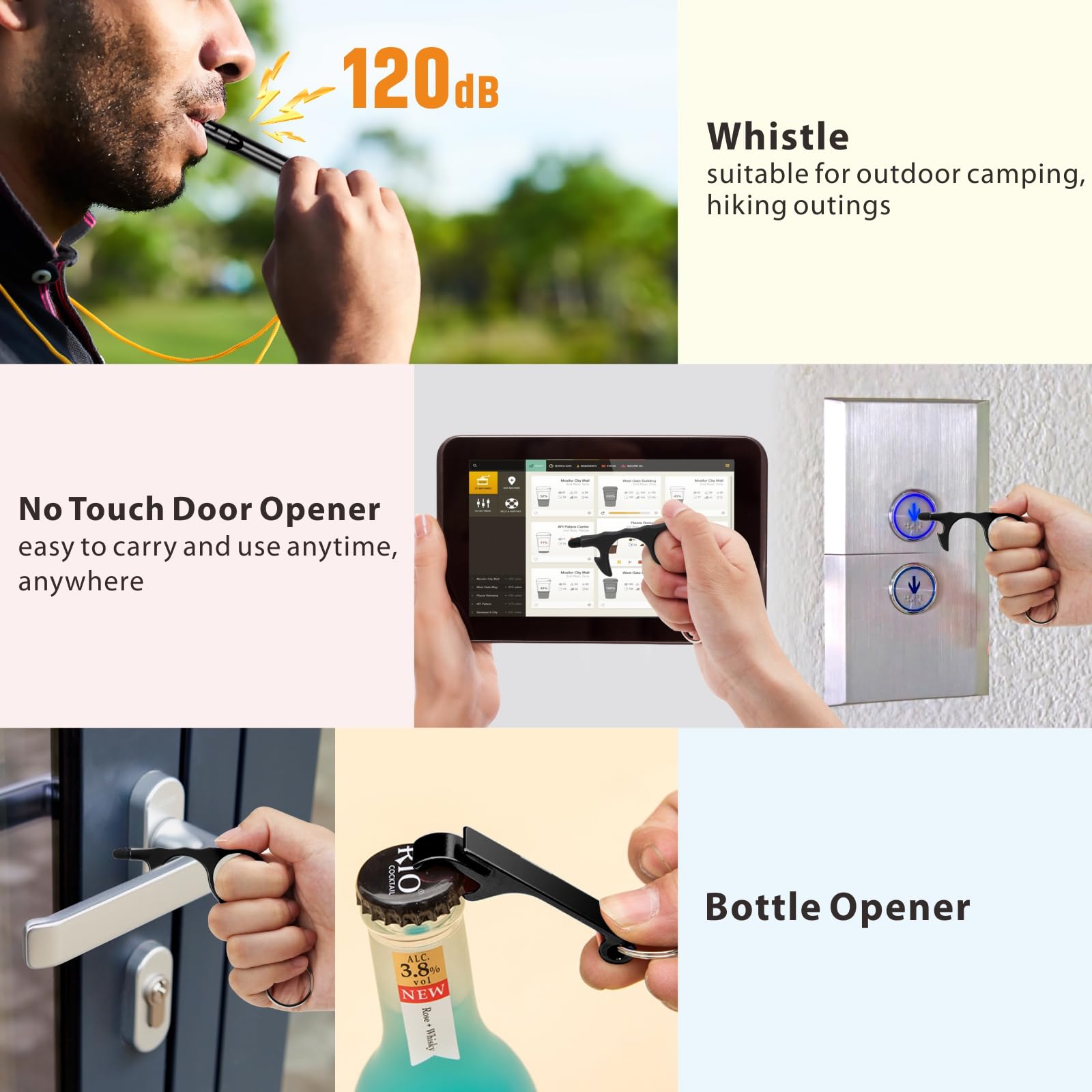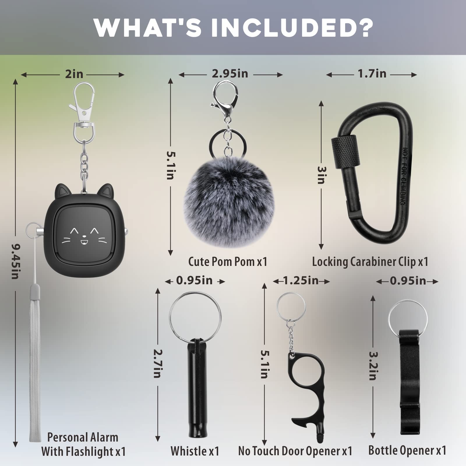 - [GIFT FOR HER] Beautiful personal safety alarm keychain set for women includes a cute personal alarm with flashlight, whistle, locking carabiner clip, no touch door opener, bottle opener, cute pom pom. Elegant Packaging, it's an ideal gift for birthday, thanksgiving day, Christmas, Valentine's Day and other occasions.