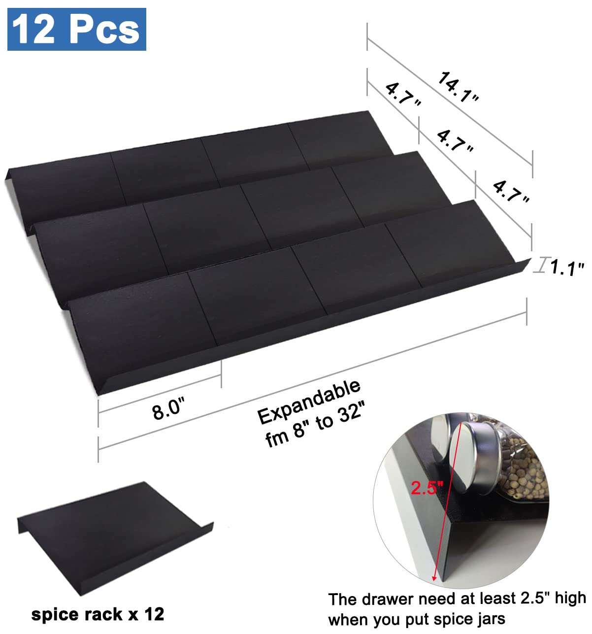 Size: Each spice organizer for drawer is 4.7W x 8L x 1.1H inches; The 12-piece set can be expanded to 14.1W x 32L x 1.1H inches