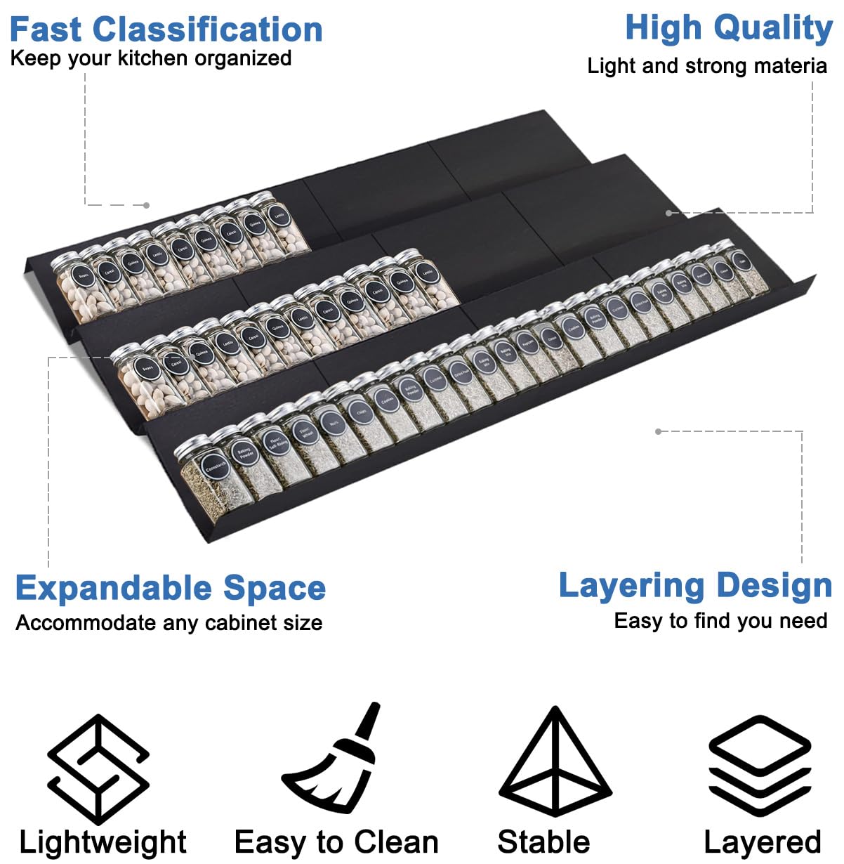 - No Need to Install Simple and Convenient - Just stack the spices and seasonings sets organizer to fit the cabinet size. Separate removable trays allow us to configure drawers according to the food we have in stock, as well as stack and expand spice rack drawer organizer according to the size of the cabinet drawers.